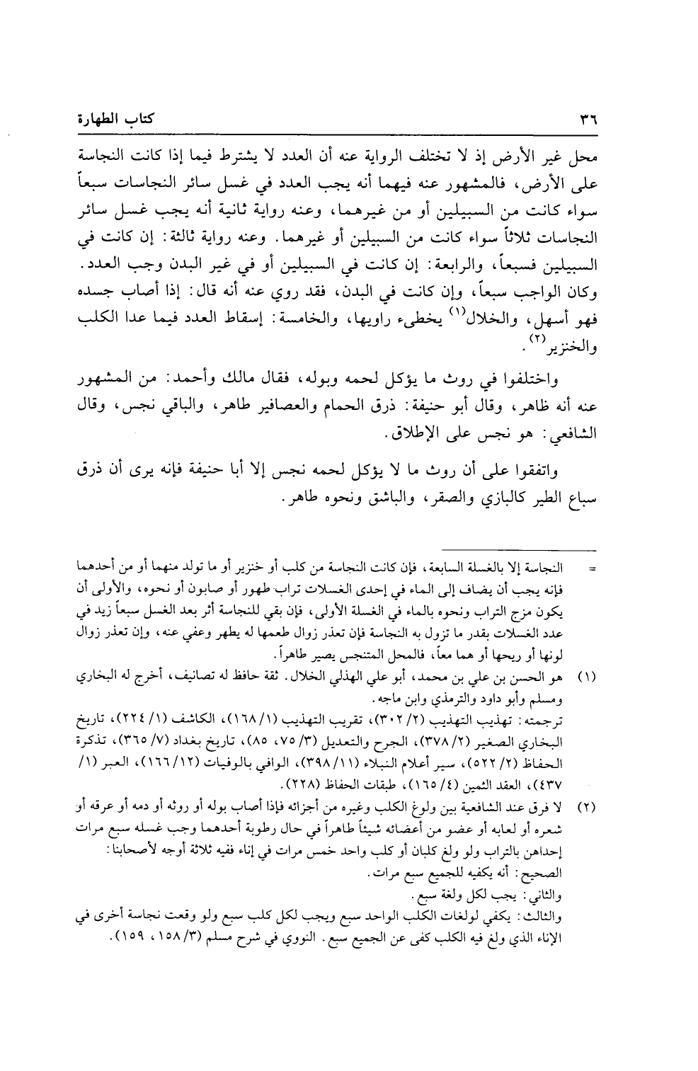 مَحل غير الأَرْض إِذْ لَا تخْتَلف الرِّوَايَة عَنهُ أَن الْعدَد لَا يشْتَرط فِيمَا إِذا كَانَت النَّجَاسَة على الأَرْض، فَالْمَشْهُور عَنهُ فيهمَا أَنه يجب الْعدَد فِي غسل سَائِر النَّجَاسَات سبعا سَوَاء كَانَت من السَّبِيلَيْنِ أَو من غَيرهمَا، وَعنهُ رِوَايَة ثَانِيَة أَنه يجب غسل سَائِر النَّجَاسَات ثَلَاثًا سَوَاء كَانَت من السَّبِيلَيْنِ أَو غَيرهمَا. وَعنهُ رِوَايَة ثَالِثَة: إِن كَانَت فِي السَّبِيلَيْنِ فسبعا، وَإِن كَانَت فِي السَّبِيلَيْنِ أَو فِي غير الْبدن وَجب الْعدَد. وَكَانَ الْوَاجِب سبعا، وَإِن كَانَت فِي الْبدن، فقد رُوِيَ عَنهُ أَنه قَالَ: إِذا أصَاب جسده فَهُوَ أسهل، والخلال يُخطئ راويها، وَالْخَامِسَة: إِسْقَاط الْعدَد فِيمَا عدا الْكَلْب وَالْخِنْزِير.