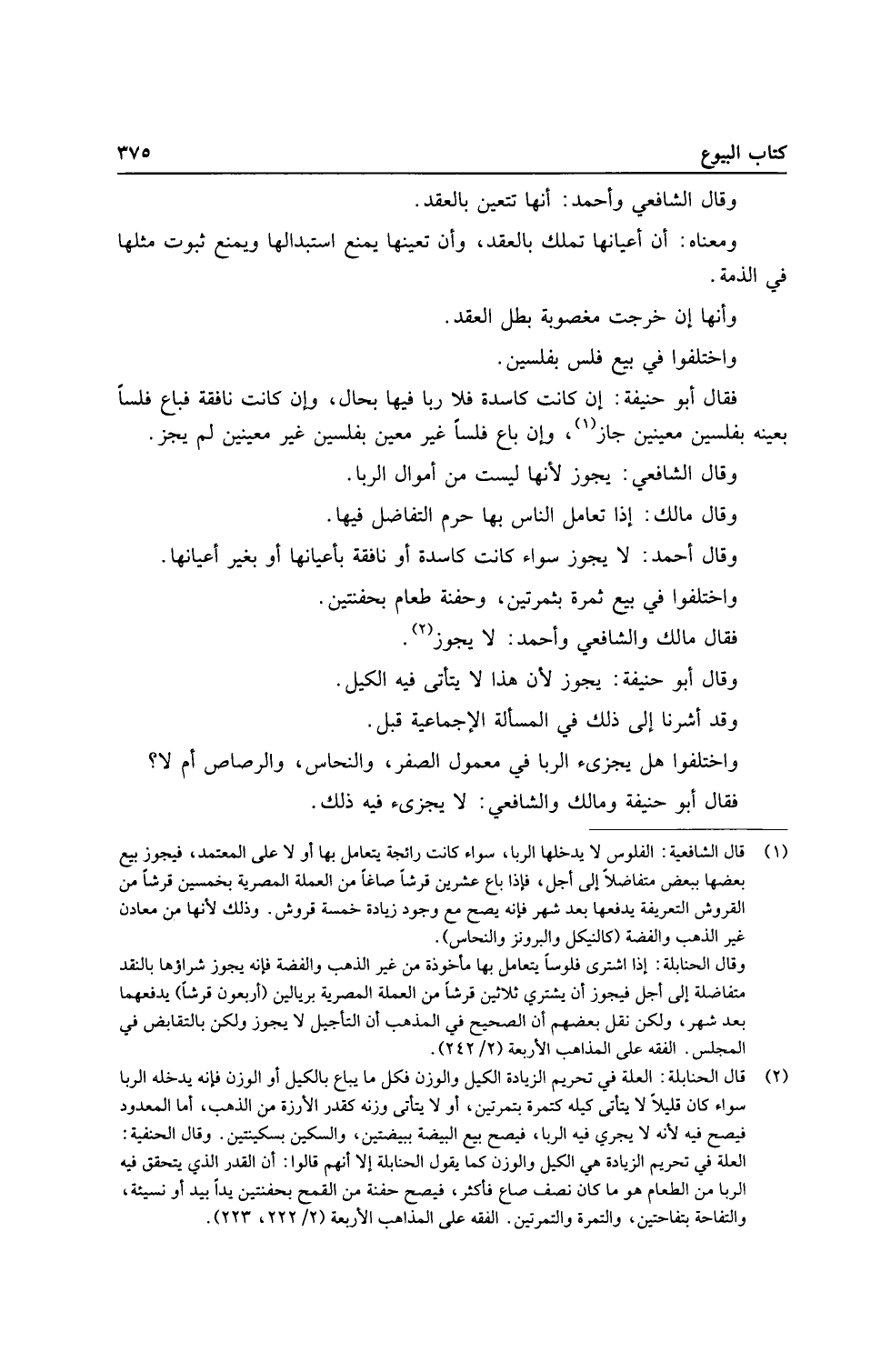 فَقَالَ أَبُو حنيفَة: إِن كَانَت كاسدة فَلَا رَبًّا فِيهَا بِحَال، وَإِن كَانَت نافقة فَبَاعَ فلسًا بِعَيْنِه بفلسين مُعينين جَازَ، وَإِن بَاعَ فلسًا غير معِين بفلسين غير مُعينين لم يجز.
