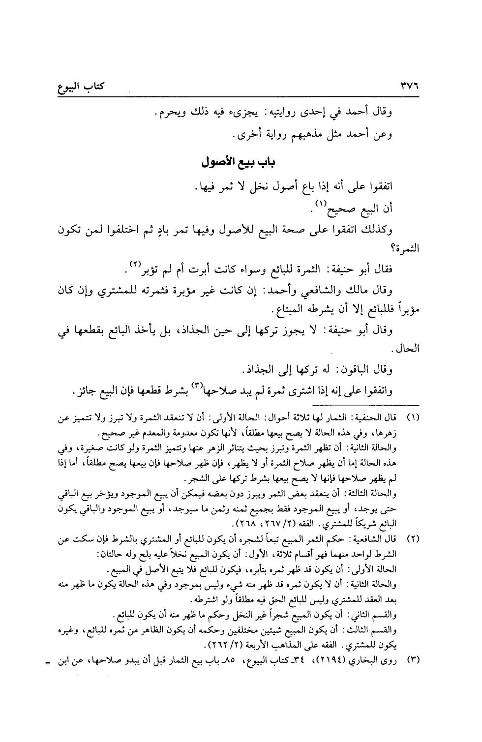 وَكَذَلِكَ اتَّفقُوا على صِحَة البيع لِلْأُصُولِ وفيهَا تمر باد ثمَّ اخْتلفُوا لمن تكون الثَّمَرَة؟