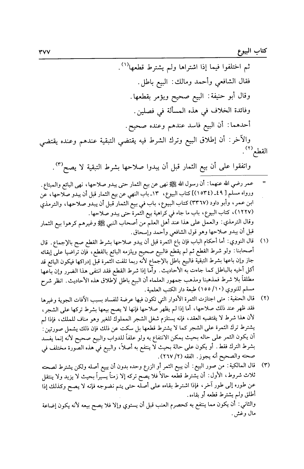 وَاتَّفَقُوا على أَن بيع الثِّمَار قبل أَن يبدوا صَلَاحهَا بِشَرْط التبقية لَا يَصح.