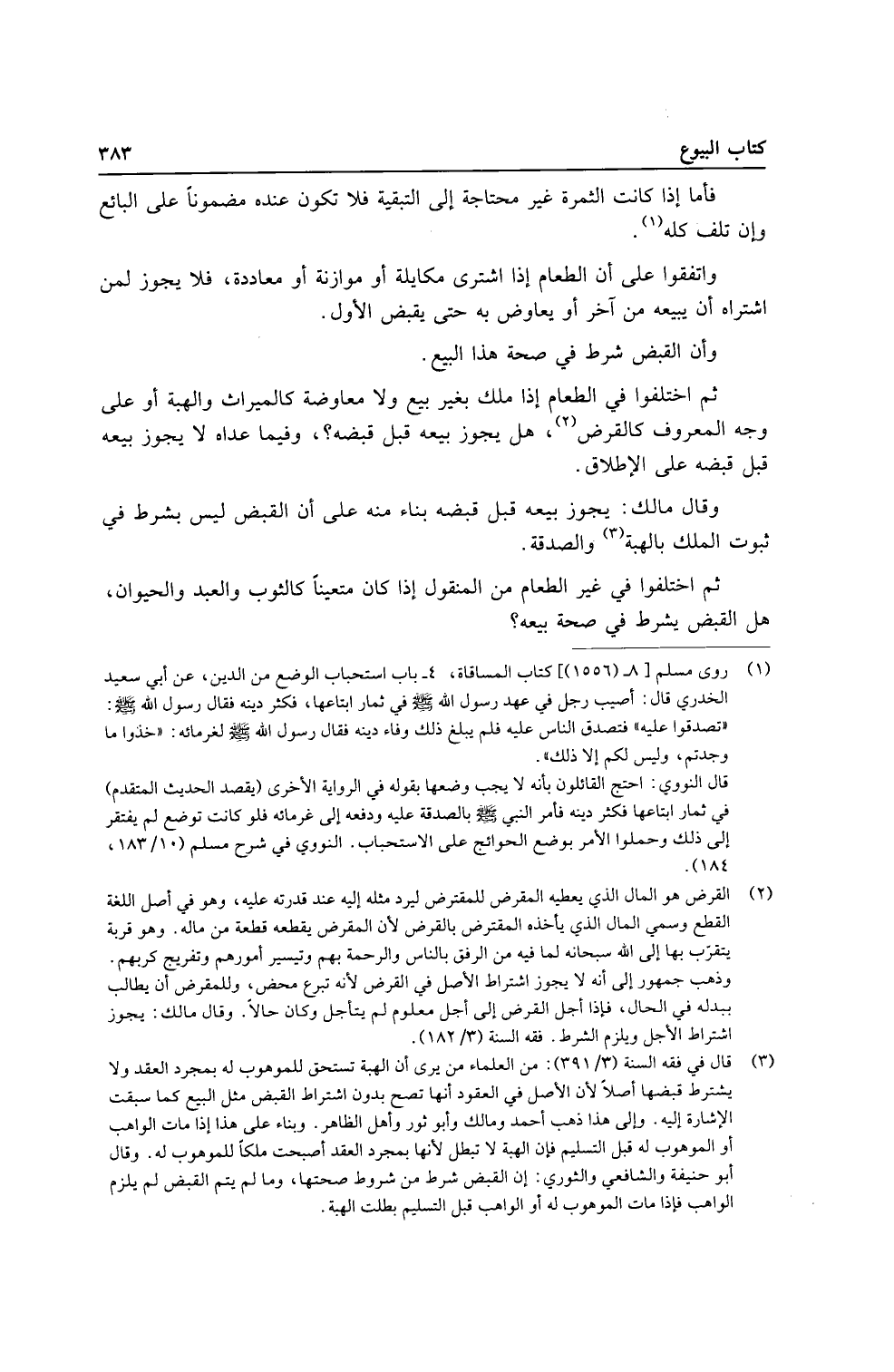 ثمَّ اخْتلفُوا فِي الطَّعَام إِذا ملك بِغَيْر بيع وَلَا مُعَاوضَة كالميراث وَالْهِبَة أَو على وَجه الْمَعْرُوف كالقرض، هَل يجوز بَيْعه قبل قَبضه؟ ، وَفِيمَا عداهُ لَا يجوز بَيْعه قبل قَبضه على الْإِطْلَاق.