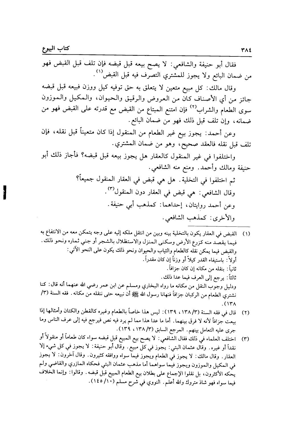 فَقَالَ أَبُو حنيفَة وَالشَّافِعِيّ: لَا يَصح بَيْعه قبل قَبضه فَإِن تلف قبل الْقَبْض فَهُوَ من ضَمَان البَائِع وَلَا يجوز للْمُشْتَرِي التَّصَرُّف فِيهِ قبل الْقَبْض.