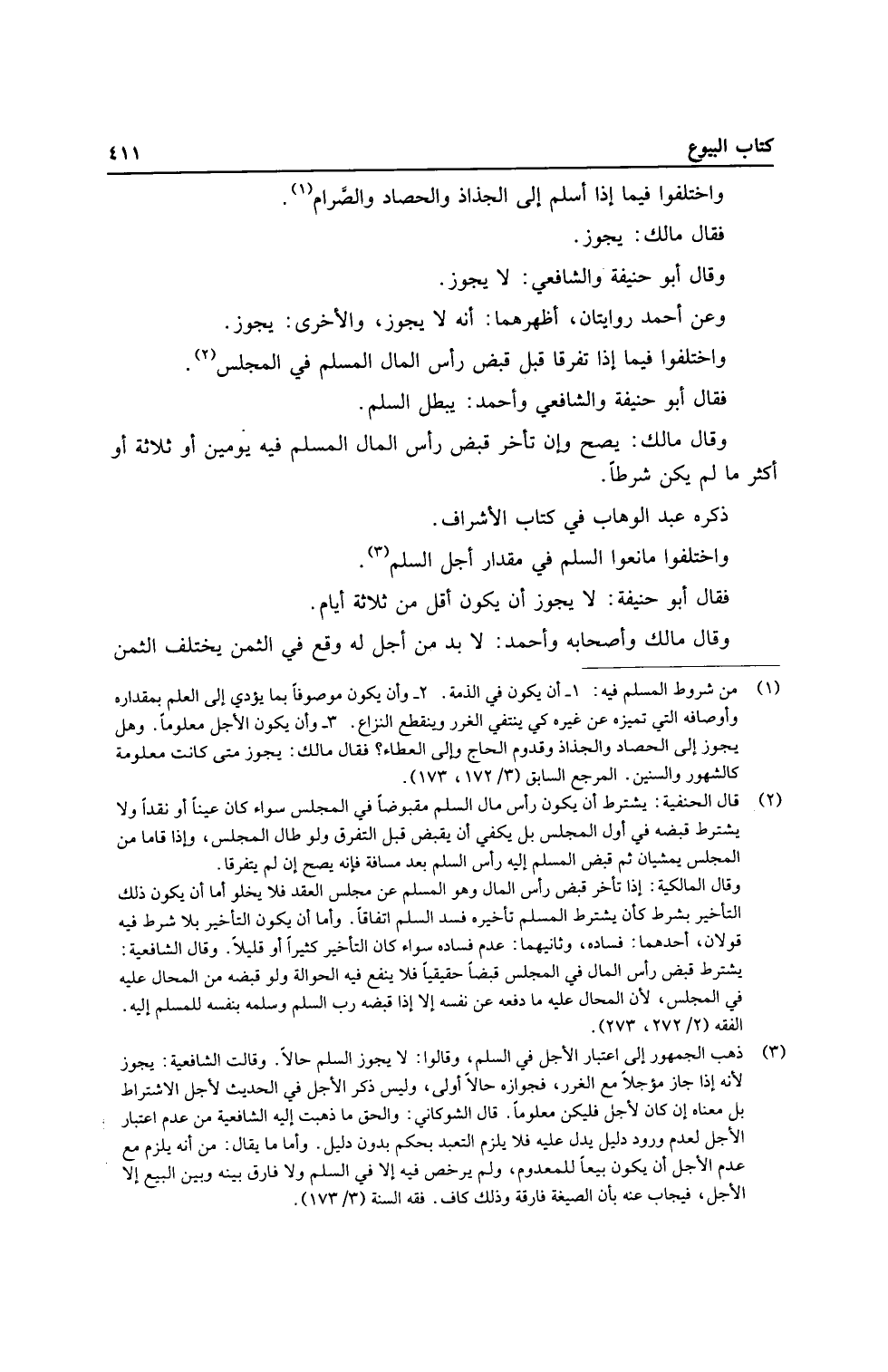 وَاخْتلفُوا فِيمَا إِذا تفَرقا قبل قبض رَأس المَال الْمُسلم فِي الْمجْلس. فَقَالَ أَبُو حنيفَة وَالشَّافِعِيّ وَأحمد: يبطل السّلم. وَقَالَ مَالك: يَصح وَإِن تَأَخّر قبض رَأس المَال الْمُسلم فِيهِ يَوْمَيْنِ أَو ثَلَاثَة أَو أَكثر مَا لم يكن شرطا.