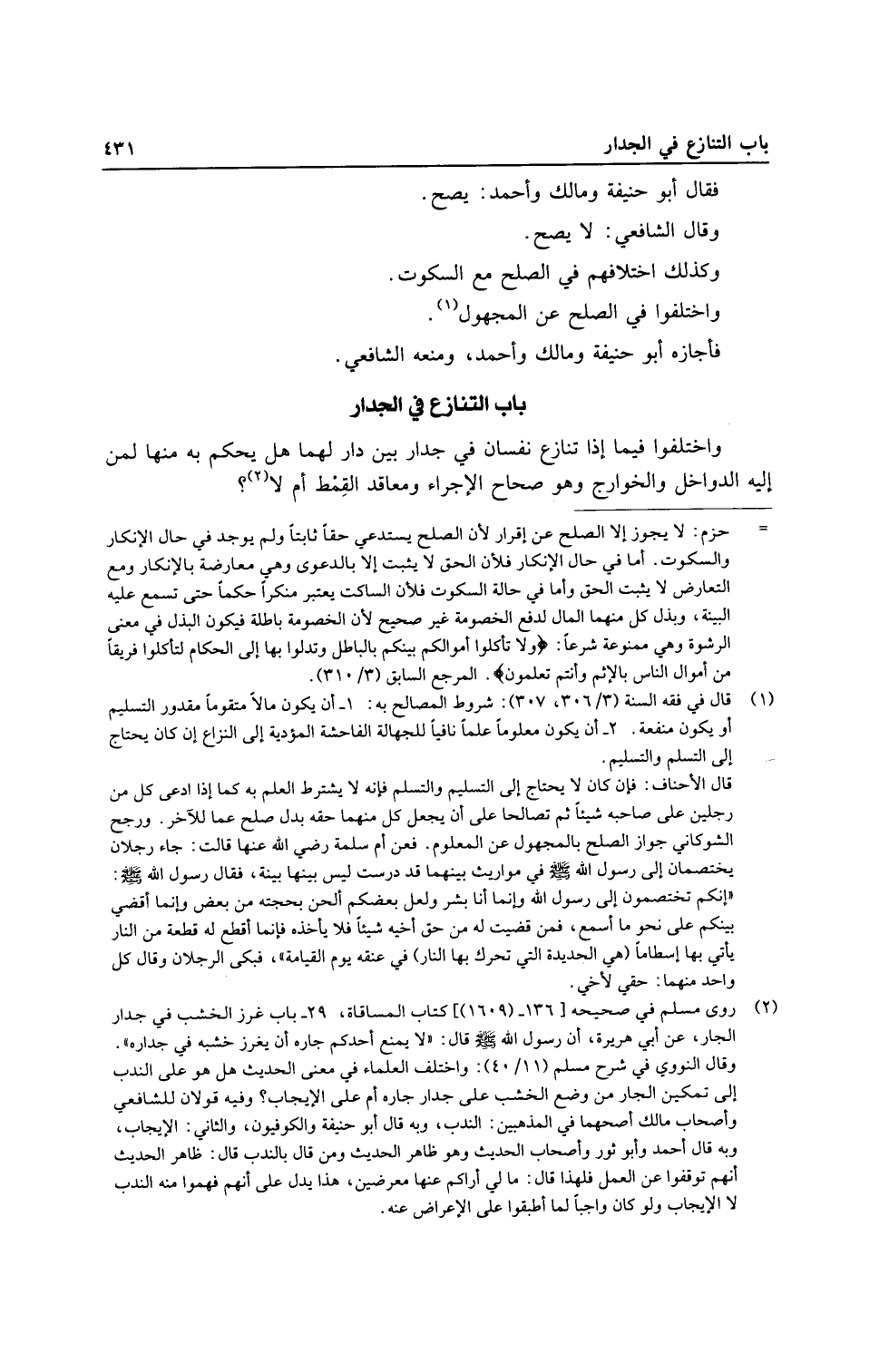 وَاخْتلفُوا فِيمَا إِذا تنَازع نفسان فِي جِدَار بَين دَار لَهما هَل يحكم بِهِ مِنْهَا لمن إِلَيْهِ الدواخل والخوارج وَهُوَ صِحَاح الإجراء ومعاقد القمط أم لَا؟
