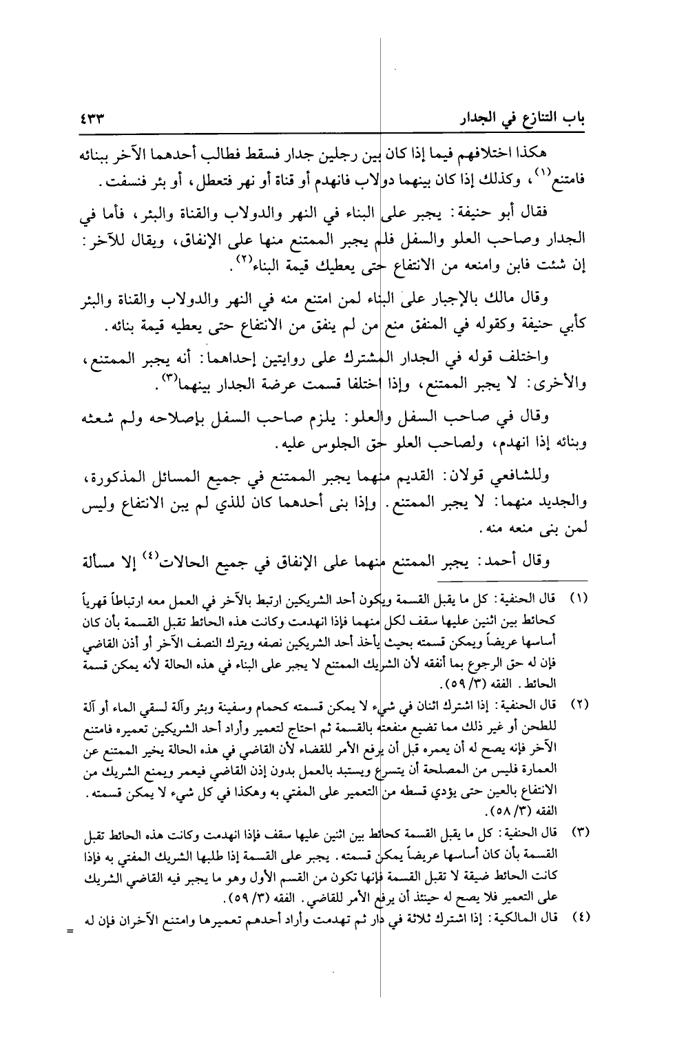 هَكَذَا اخْتلَافهمْ فِيمَا إِذا كَانَ بَين رجلَيْنِ جِدَار فَسقط فطالب أَحدهمَا الآخر ببنائه فَامْتنعَ، وَكَذَلِكَ إِذا كَانَ بَينهمَا دولاب فانهدم أَو قناة أَو نهر فتعطل، أَو بِئْر فنسفت.
