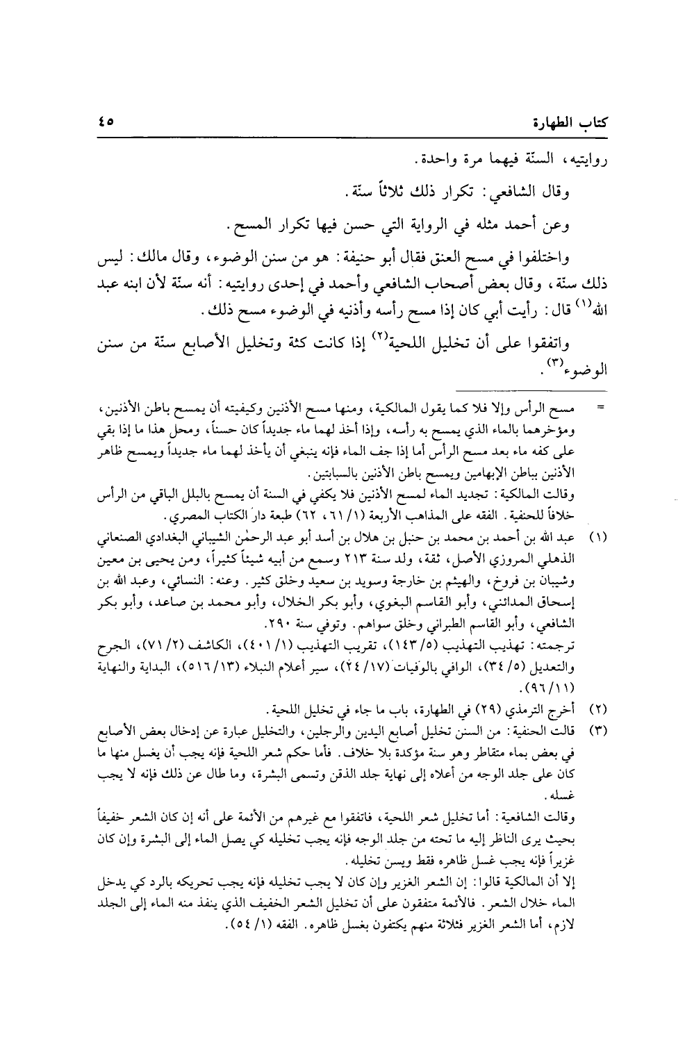 وَاخْتلفُوا فِي مسح الْعُنُق فَقَالَ: أَبُو حنيفَة: هُوَ من سنَن الْوضُوء، وَقَالَ مَالك: لَيْسَ ذَلِك سنة، وَقَالَ بعض أَصْحَاب الشَّافِعِي وَأحمد فِي إِحْدَى روايتيه: أَنه سنة لِأَن ابْنه عبد اللَّهِ قَالَ: رَأَيْت أبي كَانَ إِذا مسح رَأسه وَأُذُنَيْهِ فِي الْوضُوء مسح ذَلِك.