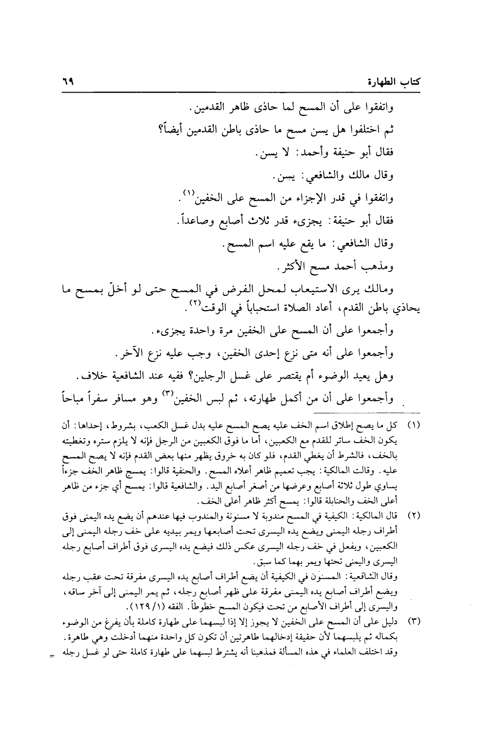 وَأَجْمعُوا على أَن من أكمل طَهَارَته، ثمَّ لبس الْخُفَّيْنِ وَهُوَ مُسَافر سفرا مُبَاحا