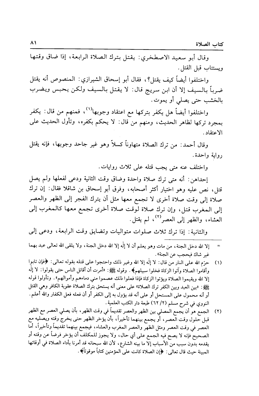 وَاخْتلفُوا أَيْضا هَل يكفر بِتَرْكِهَا مَعَ اعْتِقَاد وُجُوبهَا، فَمنهمْ من قَالَ: يكفر بِمُجَرَّد تَركهَا لظَاهِر الحَدِيث، وَمِنْهُم من قَالَ: لَا يحكم بِكُفْرِهِ، وَتَأَول الحَدِيث على الِاعْتِقَاد.