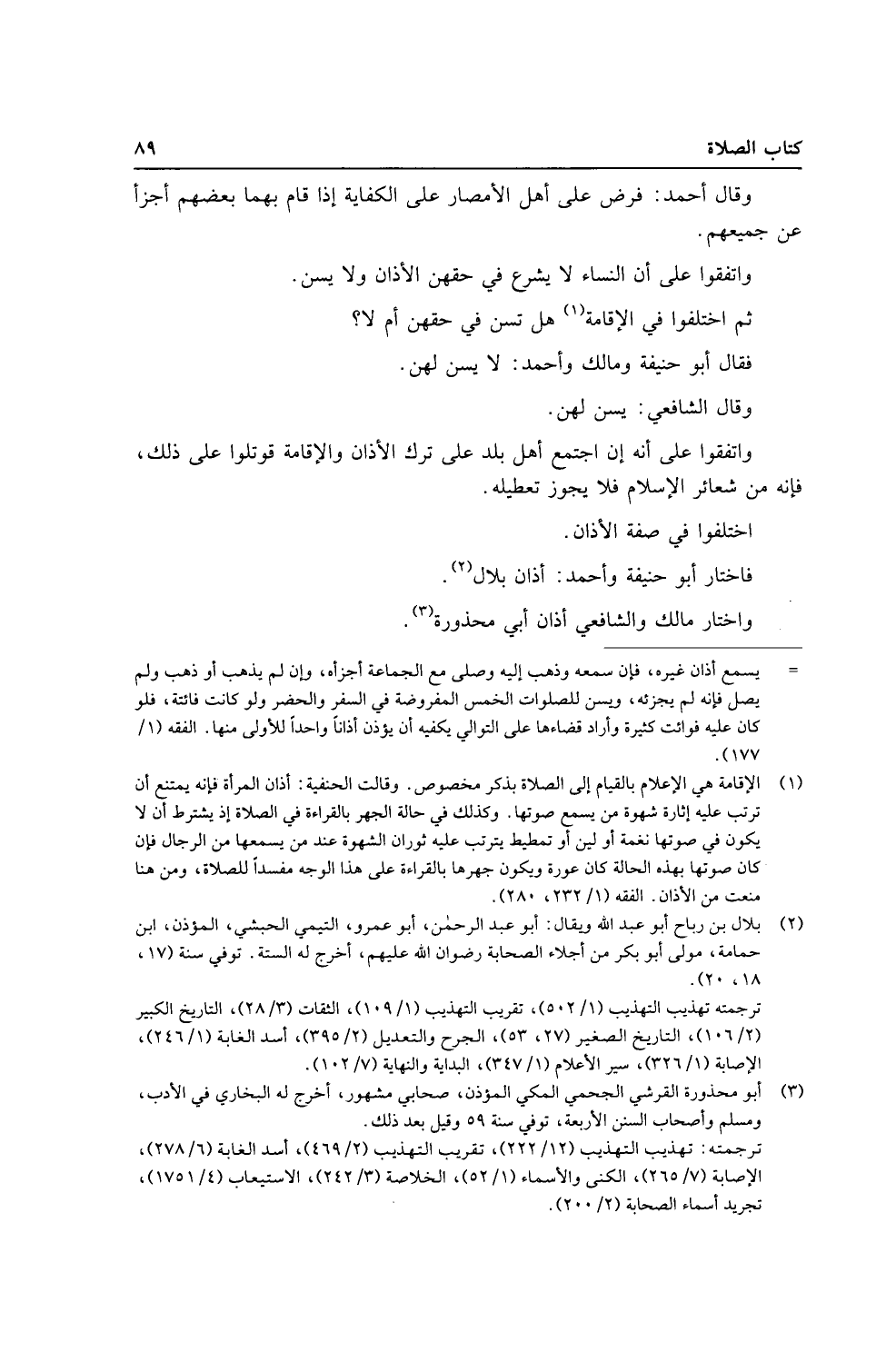 ثمَّ اخْتلفُوا فِي الْإِقَامَة هَل تسن فِي حقهن أم لَا؟