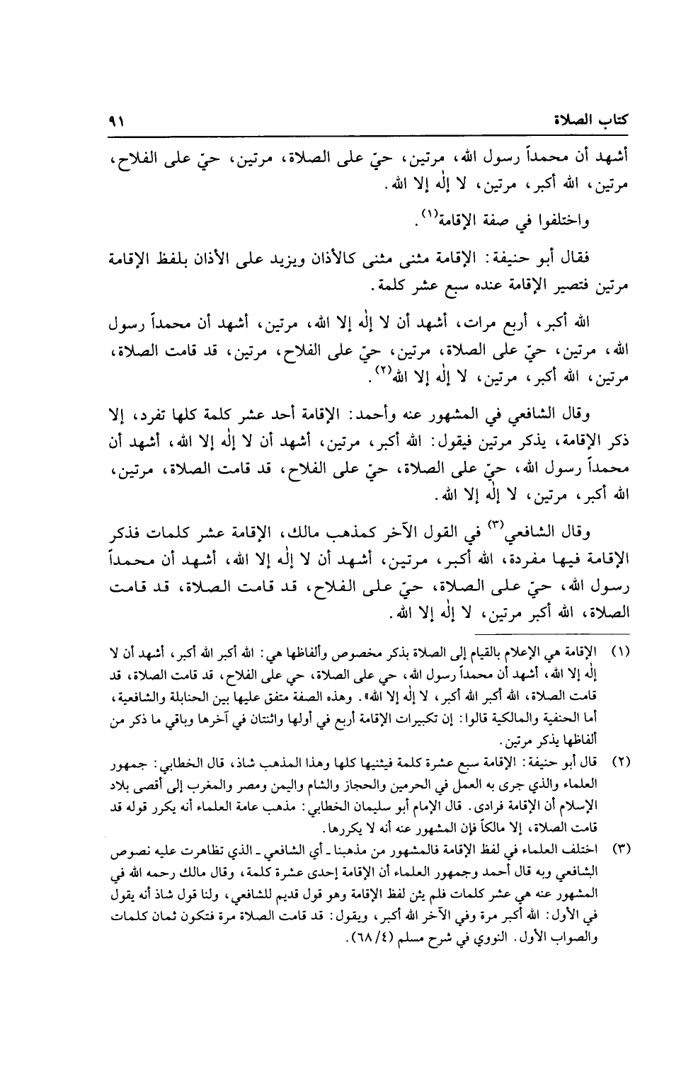 وَقَالَ الشَّافِعِي فِي القَوْل الآخر كمذهب مَالك، الْإِقَامَة عشر كَلِمَات فَذكر الْإِقَامَة فِيهَا مُفْردَة، اللَّهِ أكبر، مرَّتَيْنِ، أشهد أَن لَا إِلَه إِلَّا اللَّهِ، أشهد أَن مُحَمَّدًا رَسُول اللَّهِ، حَيّ على الصَّلَاة، حَيّ على الْفَلاح، قد قَامَت الصَّلَاة، قد قَامَت الصَّلَاة، اللَّهِ أكبر مرَّتَيْنِ، لَا إِلَه إِلَّا اللَّهِ.
