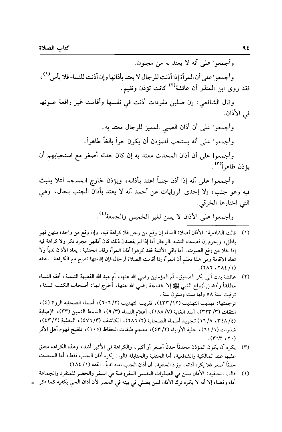 وَأَجْمعُوا على أَن الْمَرْأَة إِذا أَذِنت للرِّجَال لَا يعْتد بأذانها وَإِن أَذِنت للنِّسَاء فَلَا بَأْس، فقد روى ابْن الْمُنْذر أَن عَائِشَة كَانَت تؤذن وتقيم.