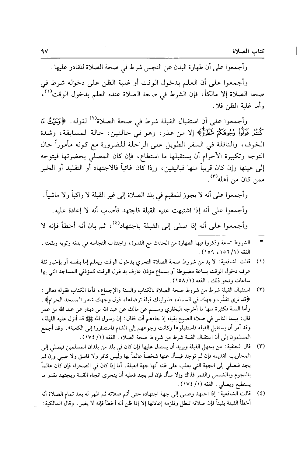 وَأَجْمعُوا على أَن اسْتِقْبَال الْقبْلَة شَرط فِي صِحَة الصَّلَاة لقَوْله: {وَحَيْثُ مَا كُنْتُم فَوَلوا وُجُوهكُم شطره} إِلَّا من عذر، وَهُوَ فِي حالتين، حَالَة الْمُسَابقَة، وَشدَّة الْخَوْف، والنافلة فِي السّفر الطَّوِيل على الرَّاحِلَة للضَّرُورَة مَعَ كَونه مَأْمُورا حَال التَّوَجُّه وتكبيره الْإِحْرَام أَن يستقبلها مَا اسْتَطَاعَ، فَإِن كَانَ الْمُصَلِّي بحضرتها فَيتَوَجَّه إِلَى عينهَا وَإِن كَانَ قَرِيبا مِنْهَا فباليقين، وَإِذا كَانَ غَائِبا فالاجتهاد أَو التَّقْلِيد أَو الْخَبَر مِمَّن كَانَ من أَهله.