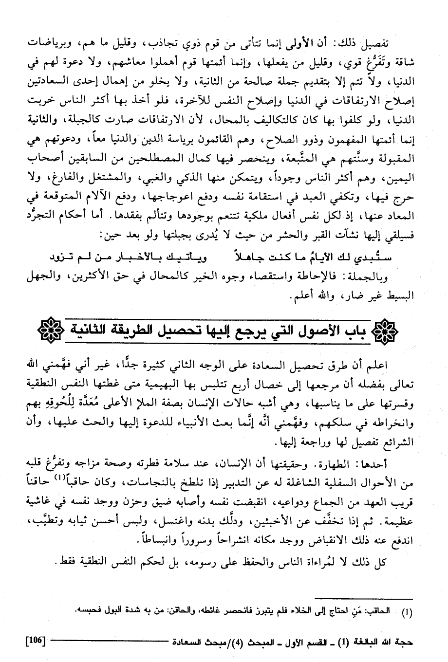 اعْلَم أَن طرق تَحْصِيل السَّعَادَة على الْوَجْه الثَّانِي كَثِيرَة جدا غير أَنِّي فهمني الله تَعَالَى بفضله أَن مرجعها إِلَى خِصَال أَربع تتلبس بهَا البهيمية مَتى غطتها النَّفس النطقية، وقسرتها على مَا يُنَاسِبهَا، وَهِي أشبه حالات الْإِنْسَان بِصفة الْمَلأ الْأَعْلَى معدة للحوقة بهم، وانخراطه فِي سلكهم، وفهمني أَنه إِنَّمَا بعث الْأَنْبِيَاء للدعوة إِلَيْهَا والحث عَلَيْهَا وَأَن الشَّرَائِع تَفْصِيل لَهَا وراجعة إِلَيْهَا.
