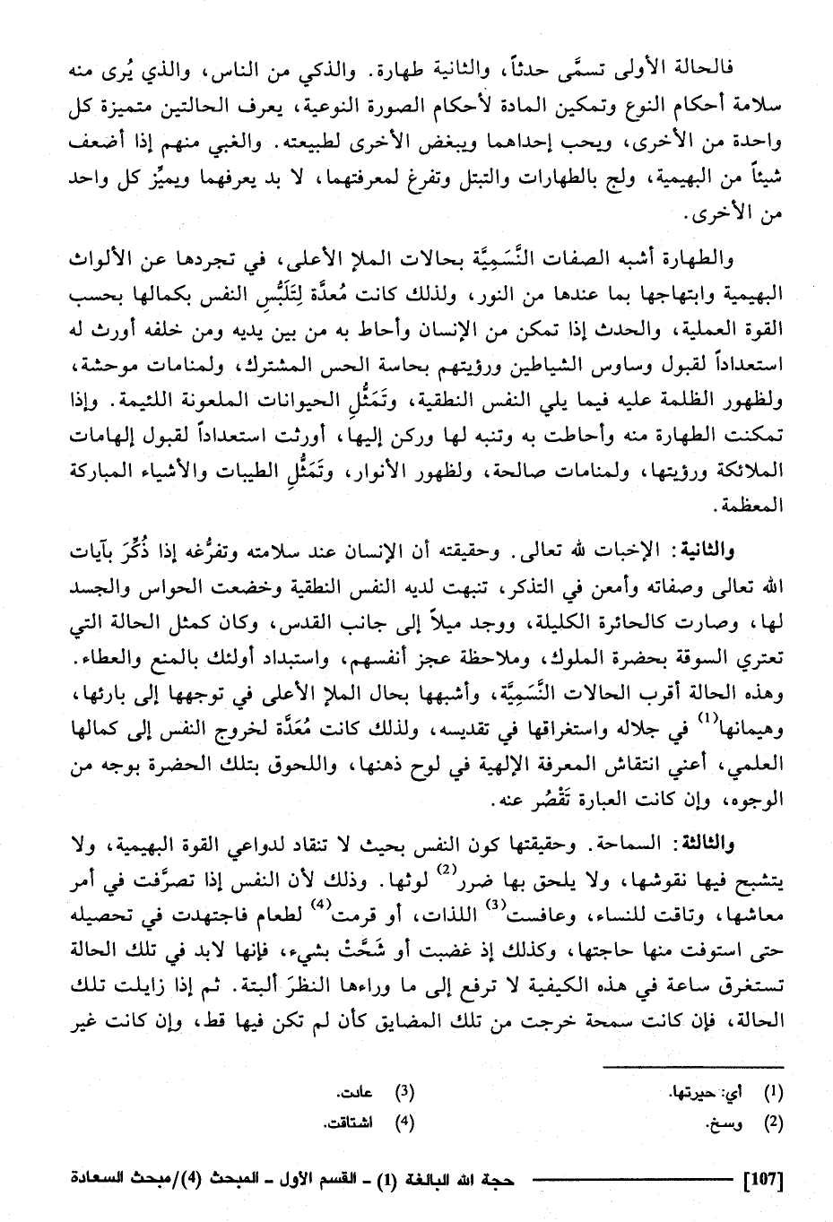 فالحالة الأولى تسمى حَدثا، وَالثَّانيَِة الطَّهَارَة، والذكي من النَّاس، وَالَّذِي يرى مِنْهُ سَلامَة أَحْكَام النَّوْع وتمكين الْمَادَّة لأحكام الصُّورَة النوعية يعرف الْحَالَتَيْنِ متميزة كل وَاحِدَة من الْأُخْرَى، وَيُحب إِحْدَاهمَا، وَيبغض الْأُخْرَى لطبيعته، والغبي مِنْهُم إِذا أَضْعَف شَيْئا من البهيمية، ولج بالطهارات والتبتل، وتفرغ لمعرفتها، لَا بُد يعرفهما ويميز كل وَاحِدَة من الْأُخْرَى، وَالطَّهَارَة أشبه الصِّفَات النسمية بحالات الْمَلأ الْأَعْلَى فِي تجردها عَن الألواث البهيمية، وابتهاجها بِمَا عِنْدهَا من النُّور، وَلذَلِك كَانَت معدة لتلبس النَّفس