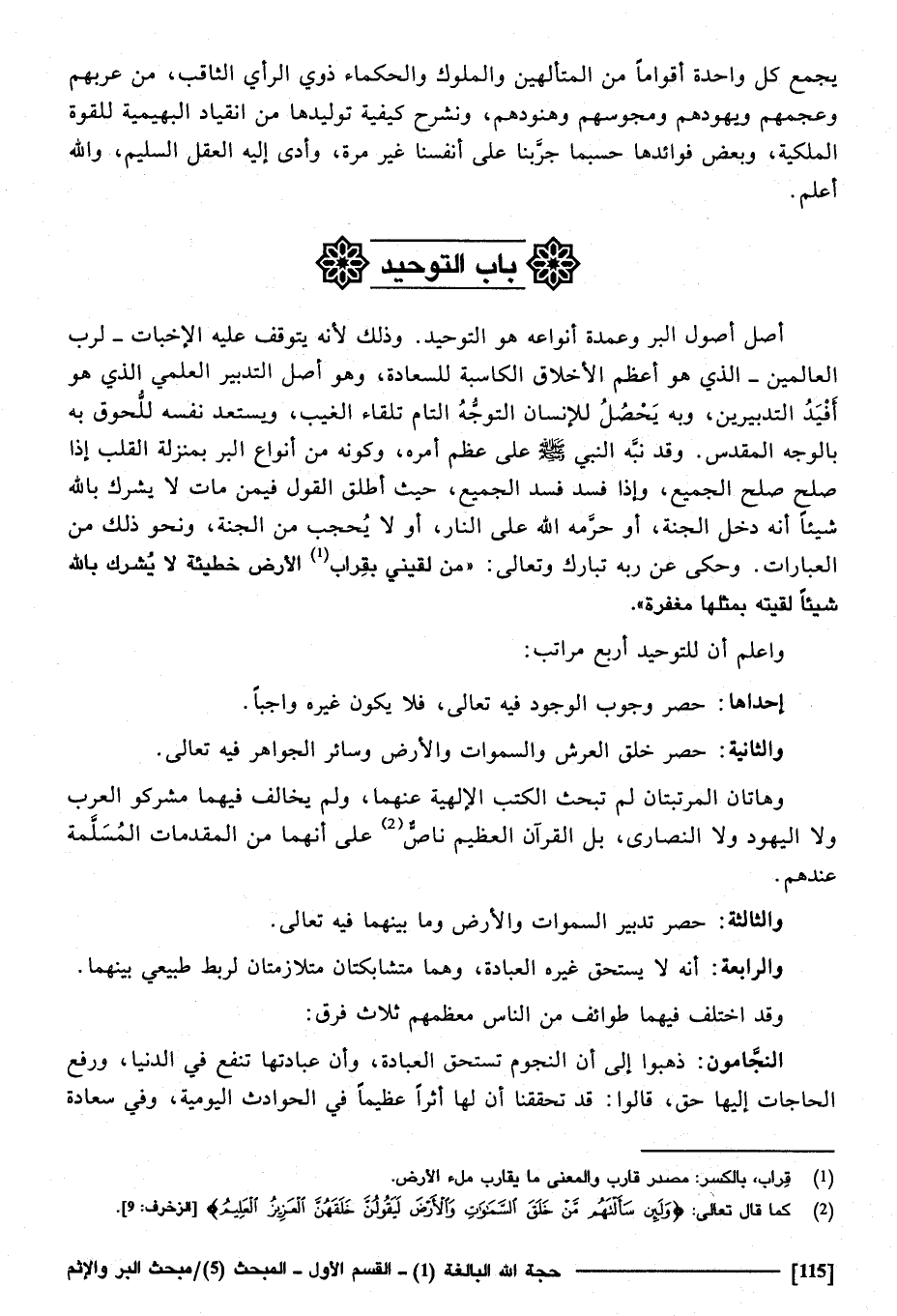 أصل أصُول الْبر، وعمدة أَنْوَاعه هُوَ التَّوْحِيد، وَذَلِكَ لِأَنَّهُ يتَوَقَّف عَلَيْهِ الإخبات لرب الْعَالمين، الَّذِي هُوَ أعظم الْأَخْلَاق الكاسبة للسعادة وَهُوَ أصل التَّدْبِير العلمي الَّذِي هُوَ أفيد التدبيرين، وَبِه يحصل للْإنْسَان التَّوَجُّه التَّام تِلْقَاء الْغَيْب، ويستعد نَفسه للحوق بِهِ بِالْوَجْهِ الْمُقَدّس، وَقد نبه النَّبِي صَلَّى اللهُ عَلَيْهِ وَسَلَّمَ على عظم أمره، وَكَونه من أَنْوَاع الْبر بِمَنْزِلَة الْقلب إِذا صلح صلح الْجَمِيع، وَإِذا فسد فسد الْجَمِيع، حَيْثُ أطلق القَوْل فِيمَن مَاتَ لَا يُشْرك بِاللَّه شَيْء شَيْئا أَنه دخل الْجنَّة، أَو حرمه الله على النَّار، أَو لَا يحجب من الْجنَّة وَنَحْو ذَلِك من الْعبارَات، وَحكى عَن ربه تبَارك وَتَعَالَى " من لَقِيَنِي بقراب الأَرْض خَطِيئَة لَا يُشْرك بِاللَّه شَيْئا لَقيته بِمِثْلِهَا مغْفرَة ".