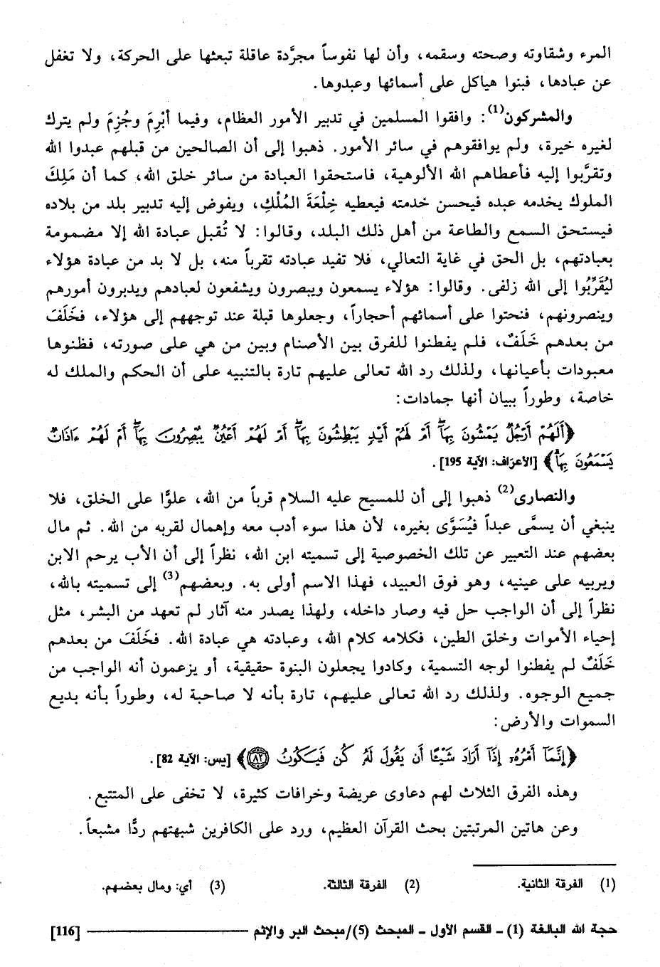 وَهَذِه الفرف الثَّلَاث لَهُم دعاوى عريضة وخرافات كَثِيرَة لَا تخفى على المتتبع، وَعَن هَاتين المرتبتين بحث الْقُرْآن الْعَظِيم، ورد على الْكَافرين شبهتهم ردا مشبعا.