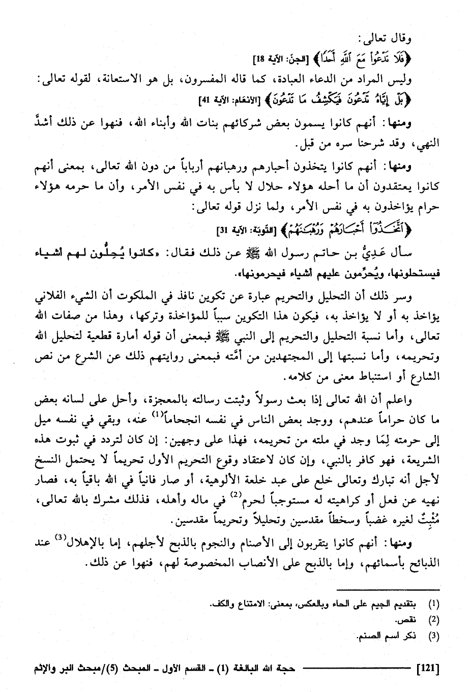 وَاعْلَم أَن الله تَعَالَى إِذا بعث رَسُولا وَثَبت رسَالَته بالمعجزة، وَأحل على لِسَانه بعض مَا كَانَ حَرَامًا عِنْدهم، وَوجد بعض النَّاس فِي نَفسه انجحاما عَنهُ، وَبَقِي فِي نَفسه ميل إِلَى حرمته لما وجد فِي مِلَّته من تَحْرِيمه فَهَذَا على وَجْهَيْن: إِن كَانَ لتردد فِي ثُبُوت هَذِه الشَّرِيعَة، فَهُوَ كَافِر بِالنَّبِيِّ، وَإِن كَانَ لاعتقاد وُقُوع التَّحْرِيم الأول تَحْرِيمًا لَا يحْتَمل النّسخ لأجل أَنه تبَارك وَتَعَالَى خلع على عبد خلعة الألوهية، أَو صَار فانيا فِي الله بَاقِيا بِهِ، فَصَارَ نَهْيه عَن فعل أَو كراهيته لَهُ مستوجبا لحرم فِي مَاله وَأَهله، فَذَلِك مُشْرك بِاللَّه تَعَالَى، مُثبت لغيره غَضبا وسخطا مقدسين وتحليلا وتحريما مقدسين.
