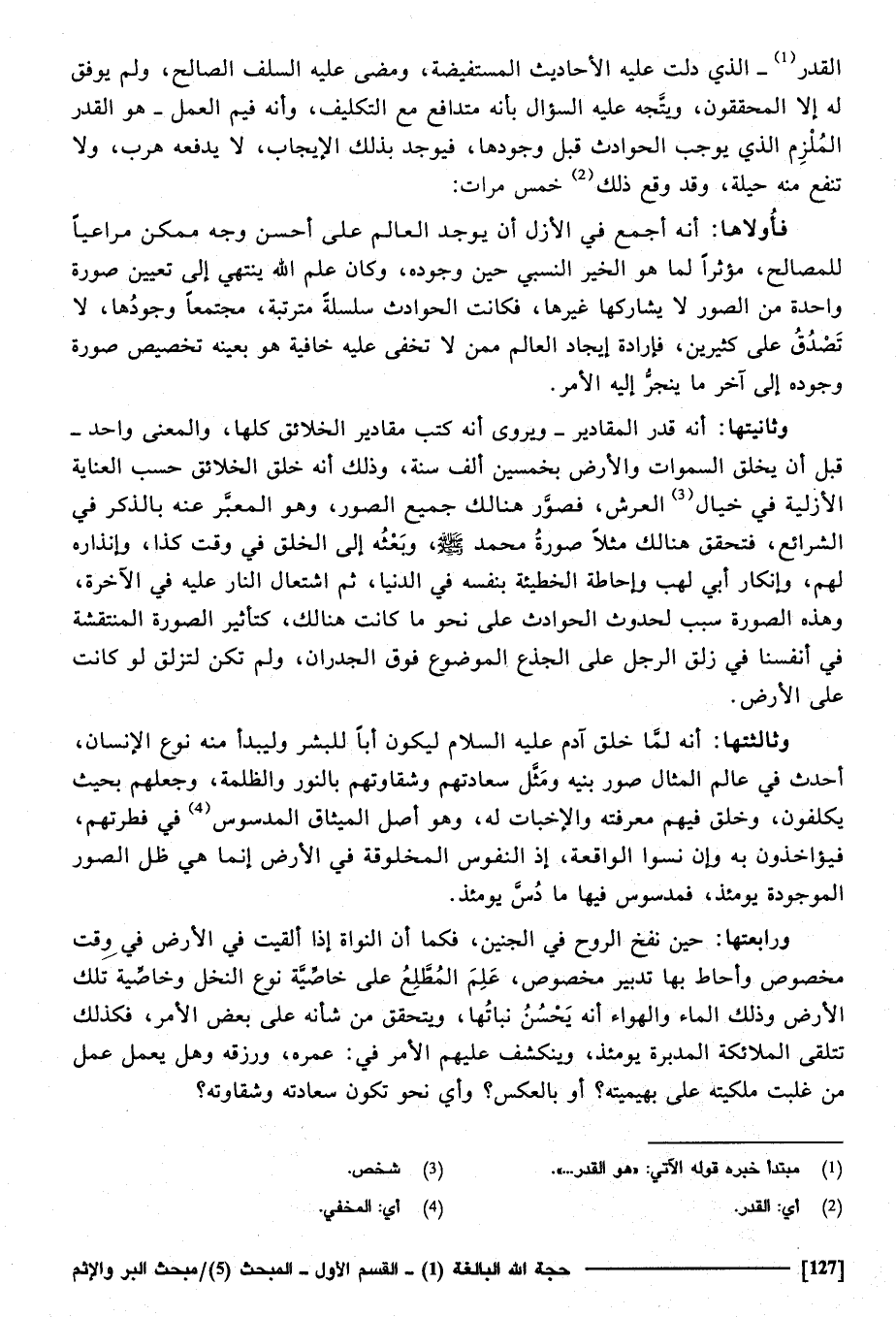 الْقدر الَّذِي دلّت عَلَيْهِ الْأَحَادِيث المستفيضة، وَمضى عَلَيْهِ السّلف الصَّالح، وَلم يوفق لَهُ إِلَّا الْمُحَقِّقُونَ، وَيتَّجه عَلَيْهِ السُّؤَال بِأَنَّهُ متدافع مَعَ التَّكْلِيف، وَأَنه فيمَ الْعَمَل - هُوَ الْقدر الملزم الَّذِي يُوجب الْحَوَادِث قبل وجودهَا، فيوجد بذلك الْإِيجَاب، لَا يَدْفَعهُ هرب، وَلَا تَنْفَع مِنْهُ حِيلَة، وَقد وَقع ذَلِك خمس مَرَّات.