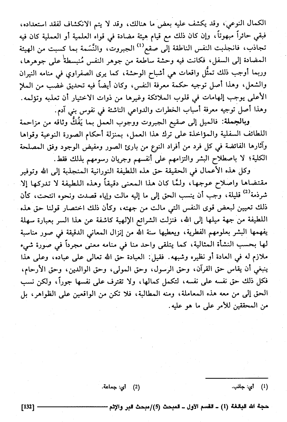 وَبِالْجُمْلَةِ فالميل إِلَى صقيع الجبروت وَوُجُوب الْعَمَل بِمَا يفك وثَاقه من مزاحمة اللطائف السفلية الْمُؤَاخَذَة على ترك هَذَا الْعَمَل بِمَنْزِلَة أَحْكَام الصُّورَة النوعية وقواها وآثارها الفائضة فِي كل فَرد من أَفْرَاد النَّوْع من بارئ الصُّور ومفيض الْوُجُود وفْق الْمصلحَة الْكُلية لَا باصطلاح الْبشر والتزامهم على أنفسهم وجريان رسومهم بذلك فَقَط، وكل هَذِه الْأَعْمَال فِي الْحَقِيقَة حق هَذِه اللطيفة النورانية المنجذبة إِلَى الله وتوفير مقتضاها واصلاح عوجها، وَلما كَانَ هَذَا الْمَعْنى دَقِيقًا وَهَذِه اللطيفة لَا تدركها إِلَّا شرذمة