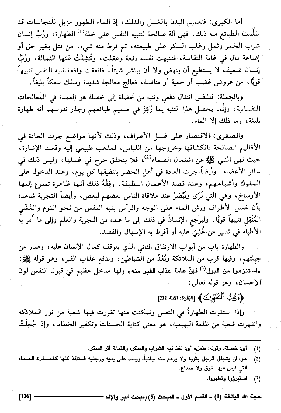 أما الْكُبْرَى فتععيم الْبدن بِالْغسْلِ والدك، إِذْ المَاء طهُور مزيل للنجاسات قد سلمت الطقد سلمت الطبائغ مِنْهُ ذَلِك، فَهِيَ آلَة صَالِحَة لتنبيه النَّفس على خلة الطَّهَارَة، وَرب إِنْسَان شرب الْخمر، وثمل، وَغلب السكر على طبيعة، ثمَّ فرط مِنْهُ شَيْء من قتل بِغَيْر حق، أَو إِضَاعَة مَال فِي غَايَة النفاسة،