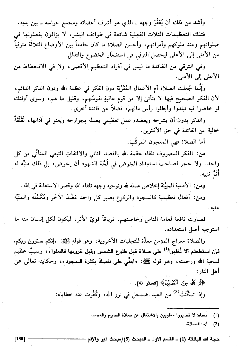 أما الصَّلَاة فَهِيَ المعجون الْمركب من الْفِكر المصروف تِلْقَاء عَظمَة الله بِالْقَصْدِ الثَّانِي، والالتفات التبعي المتأتي من كل وَاحِد، وَلَا حجر لصَاحب استعداد الْخَوْض فِي لجة الشُّهُود أَن يَخُوض، بل ذَلِك مُنَبّه لَهُ أتم تَنْبِيه، وَمن الْأَدْعِيَة المبينة إخلاص عمله لله وتوجيه وَجهه تِلْقَاء الله وَقصر الِاسْتِعَانَة فِي الله، وَمن أَفعَال تعظيمية كالسجود وَالرُّكُوع يصير كل وَاحِد عضد الآخر ومكمله والمنبه عَلَيْهِ، فَصَارَت نافعة لعامة النَّاس وخاصتهم، تريافا قوى الْأَثر ليَكُون لكل إِنْسَان مِنْهُ مَا استوجبه أصل استعداده، وَالصَّلَاة مِعْرَاج الْمُؤمن معدة للتجليات الأخروية، وَهُوَ قَوْله صَلَّى اللهُ عَلَيْهِ وَسَلَّمَ: " إِنَّكُم سَتَرَوْنَ ربكُم فَإِذا اسْتَطَعْتُم أَلا تغلبُوا على صَلَاة قبل طُلُوع الشَّمْس وَقبل غُرُوبهَا فافعلوا " وَسبب عَظِيم لمحبة الله وَرَحمته وَهُوَ قَوْله صَلَّى اللهُ عَلَيْهِ وَسَلَّمَ. " أَعنِي على نَفسك بِكَثْرَة السُّجُود " وحكايته تَعَالَى عَن أهل النَّار