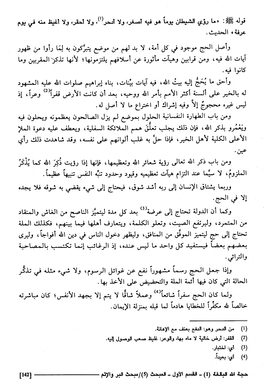 وكما أَن الدولة تحْتَاج إِلَى عرضة بعد كل مُدَّة؛ ليتميز الناصح من الغاش والمنقاد من المتمرد، وليرتفع الصيت، وَتَعْلُو الْكَلِمَة، ويتعارف أَهلهَا فِيمَا بَينهم، فَكَذَلِك الْملَّة تحْتَاج إِلَى حج ليتميز الْمُوفق من الْمُنَافِق،