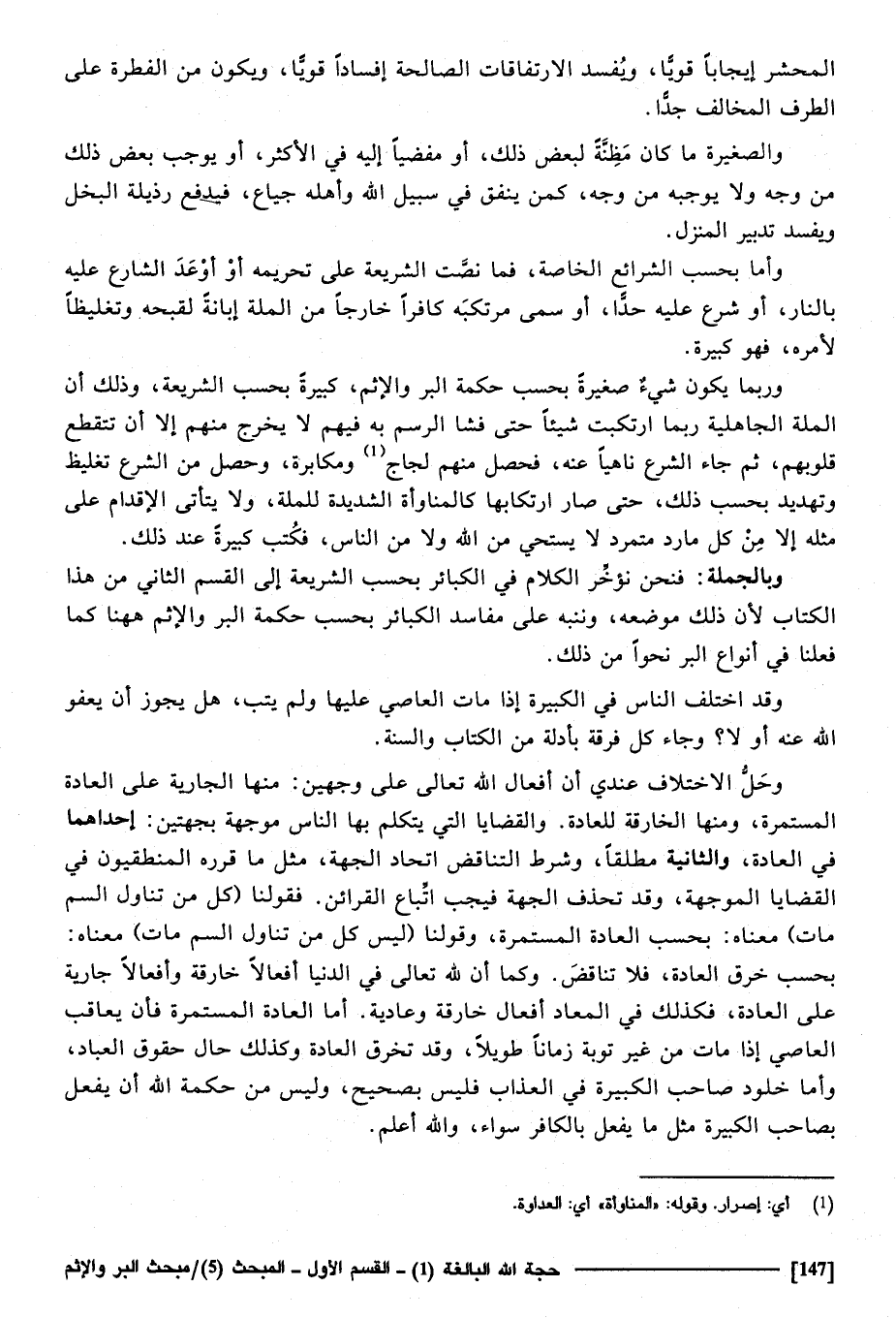 وَبِالْجُمْلَةِ فَنحْن نؤخر الْكَلَام فِي الْكَبَائِر بِحَسب الشَّرِيعَة إِلَى الْقسم الثَّانِي من هَذَا الْكتاب لِأَن ذَلِك مَوْضِعه، وننبه على مفاسد الْكَبَائِر بِحَسب حِكْمَة الْبر والاثم هَهُنَا كَمَا فعلنَا فِي أَنْوَاع الْبر نَحوا من ذَلِك.