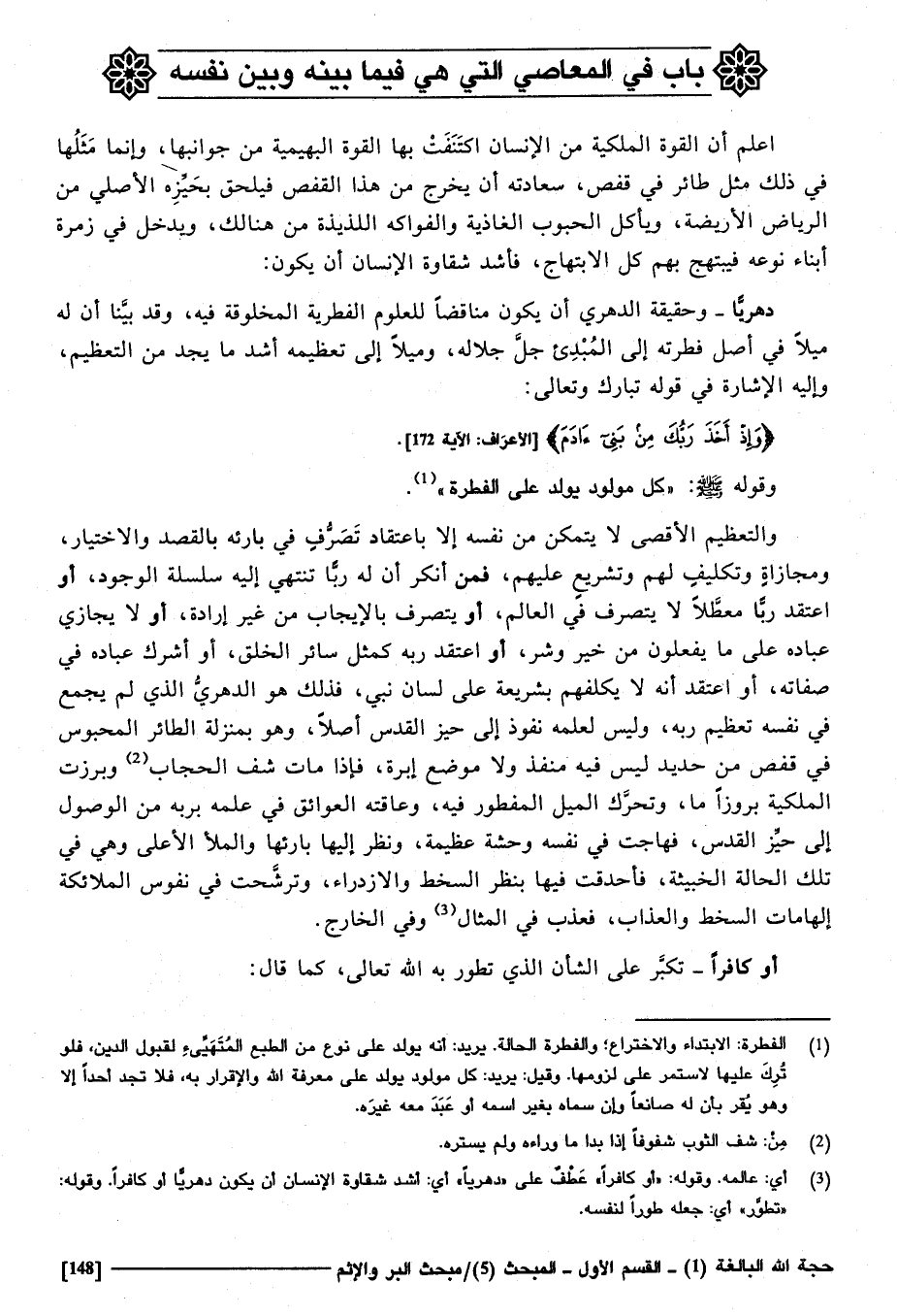 وَقَوله صَلَّى اللهُ عَلَيْهِ وَسَلَّمَ: " كل مَوْلُود يُولد على الْفطْرَة " والتعظيم الْأَقْصَى لَا يتَمَكَّن من نَفسه إِلَّا باعتقاد تصرف فِي بارئه بِالْقَصْدِ وَالِاخْتِيَار ومجازاة وتكليف لَهُم وتشريع عَلَيْهِم، فَمن أنكر أَن لَهُ رَبًّا تَنْتَهِي إِلَيْهِ سلسلة الْوُجُود، أَو اعْتقد رَبًّا معطلا لَا يتَصَرَّف فِي الْعَالم أَو يتَصَرَّف فِي بِالْإِيجَابِ من غير إِرَادَة أَو لَا يجازى عباده على مَا يَفْعَلُونَ من خير وَشر، أَو أعتقد