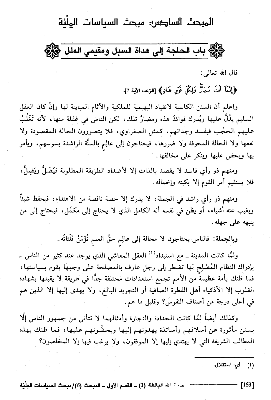 وَلما كَانَت الْمَدِينَة مَعَ استبداد الْعقل المعاشى الَّذِي يُوجد عِنْد كثير من النَّاس بِإِدْرَاك النظام المصلح لَهَا تضطر إِلَى رجل عَارِف بِالْمَصْلَحَةِ على وَجههَا يقوم بسياستها، فَمَا ظَنك بِأمة عَظِيمَة من الْأُمَم تجمع استعدادات مُخْتَلفَة جدا فِي طَريقَة لَا يقبلهَا بِشَهَادَة الْقُلُوب إِلَّا الازكياء أهل الْفطْرَة الصافية أَو التَّجْرِيد الْبَالِغ، وَلَا يهدى إِلَيْهَا إِلَّا الَّذين هم فِي أَعلَى دَرَجَة من أَصْنَاف النُّفُوس - وَقَلِيل مَا هم.