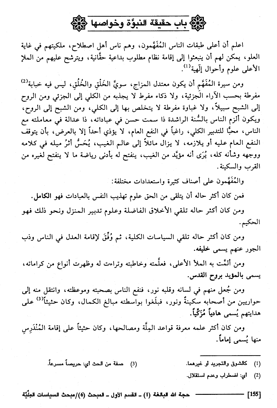 اعْلَم أَن أَعلَى طَبَقَات النَّاس المفهمون، وهم نَاس أهل اصْطِلَاح ملكيتهم فِي غَايَة الْعُلُوّ، يُمكن لَهُم أَن ينبعثوا إِلَى إِقَامَة نظام مَطْلُوب بداعية حقانية، ويترشح عَلَيْهِم من الْمَلأ الْأَعْلَى عُلُوم وأحوال إلهية، وَمن سيرة الْمُفْهم أَن يكون معتدل المزاج سوي الْخلق والخلق لَيْسَ فِيهِ خبابة مفرطة بِحَسب الآراء الْجُزْئِيَّة، وَلَا ذكاء مفرط لَا يجذبه من الكلى إِلَى الجزئي، وَمن الرّوح إِلَى الشبح سَبِيلا، وَلَا غباوة مفرطة لَا يتَخَلَّص بهَا إِلَى الكلى، وَمن الشبح إِلَى الرّوح، وَيكون ألزم النَّاس من بِالسنةِ الراشدة ذَا سمت حسن فِي عباداته، ذَا عَدَالَة فِي مُعَامَلَته مَعَ النَّاس، محبا للتدبير الْكُلِّي، رَاغِبًا فِي النَّفْع الْعَام، لَا يُؤْذِي أحدا إِلَّا بِالْعرضِ بِأَن يتَوَقَّف النَّفْع الْعَام عَلَيْهِ أَو يلازمه، لَا يزَال مائلا إِلَى عَالم الْغَيْب، يحس أثر ميله فِي كَلَامه وَوجه وشأنه كُله، يرى أَنه مؤيد من الْغَيْب، ينفتح لَهُ بِأَدْنَى رياضة مَا لَا ينفتح لغيره من الْقرب والسكينة.