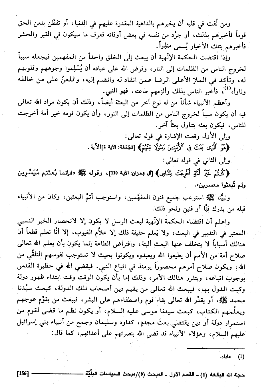 وَإِذا اقْتَضَت الْحِكْمَة الالهية أَن يبْعَث إِلَى الْخلق وَاحِد من المفهمين، فَيَجْعَلهُ سَببا لخُرُوج النَّاس من الظُّلُمَات إِلَى النَّار، وَفرض الله على عباده أَن يسلمُوا وُجُوههم وَقُلُوبهمْ لَهُ، وتأكد فِي الْمَلأ الْأَعْلَى الرِّضَا عَمَّن انْقَادَ لَهُ، وانضم إِلَيْهِ، واللعن على من خَالفه، وناوأه فَأخْبر النَّاس بذلك، وألزمهم طَاعَته فَهُوَ النَّبِي، وَأعظم الْأَنْبِيَاء شَأْنًا من لَهُ نوع آخر من الْبعْثَة أَيْضا، وَذَلِكَ أَن يكون مُرَاد الله تَعَالَى فِيهِ أَن يكون سَببا لخُرُوج النَّاس من الظُّلُمَات إِلَى النُّور، وَأَن يكون قومه خير أمة أخرجت للنَّاس، فَيكون بَعثه يتَنَاوَل بعثا آخر.