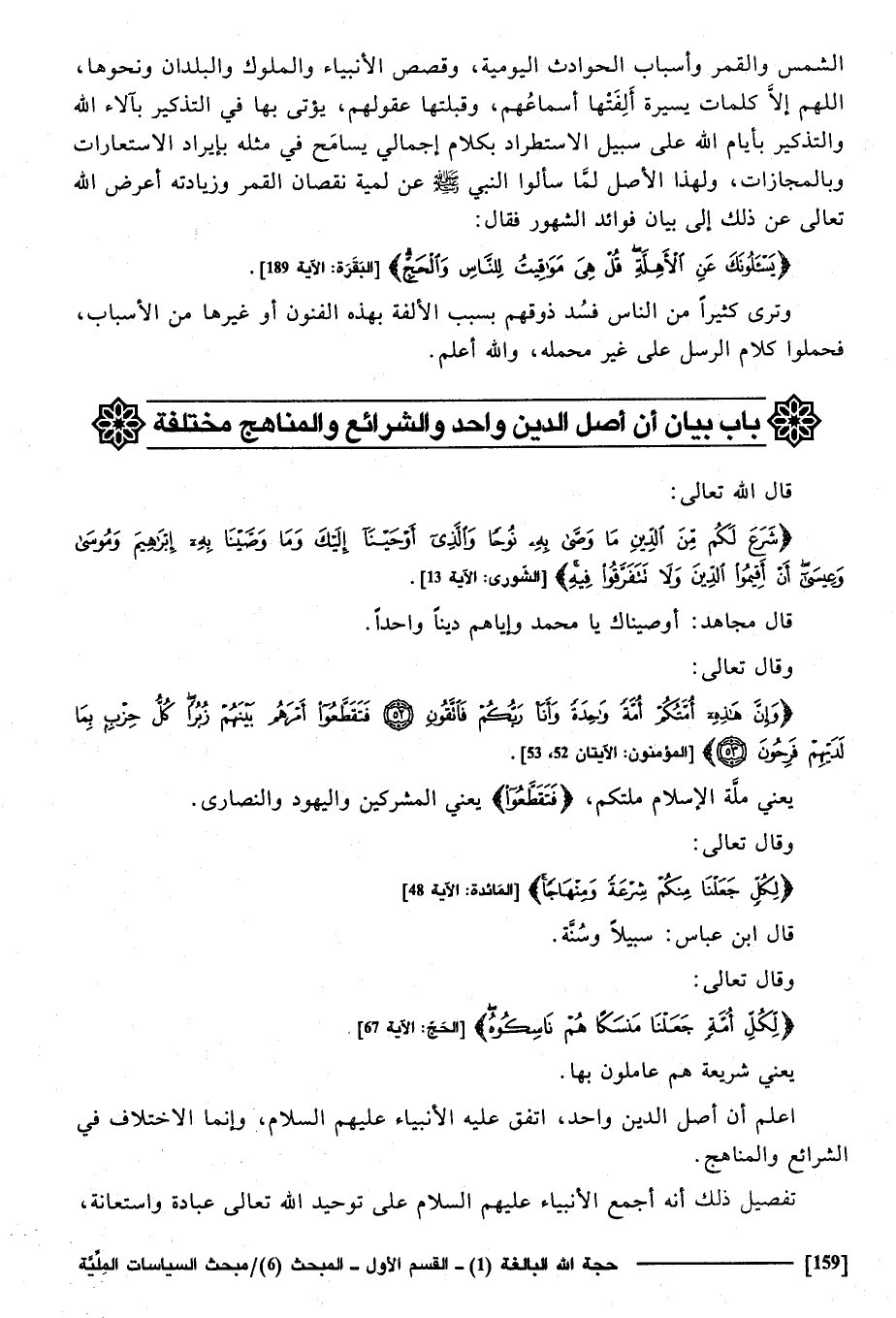 اعْلَم أَن أصل الدّين وَاحِد اتّفق عَلَيْهِ الْأَنْبِيَاء عَلَيْهِم السَّلَام، وَإِنَّمَا الِاخْتِلَاف فِي الشَّرَائِع والمناهج.