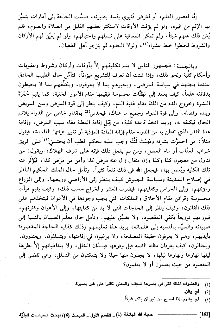 وَبِالْجُمْلَةِ فجمهور النَّاس لَا يتم تكليفهم إِلَّا بأوقات وأركان وشروط وعقوبات وَأَحْكَام كُلية، وَنَحْو ذَلِك، وَإِذا شِئْت أَن تعرف للتشريع ميزانا، فَتَأمل حَال الطَّبِيب الحاذق عِنْدَمَا يجْتَهد فِي سياسة المرضى، ويخبرهم بِمَا لَا يعْرفُونَ، ويكلفهم بِمَا لَا يحيطون بدقائقه علما كَيفَ يعمد إِلَى مظنات محسوسة، فيقيمها مقَام الْأُمُور الْخفية كَمَا يُقيم حمرَة الْبشرَة وَخُرُوج الدَّم من اللثة مقَام غَلَبَة الدَّم، وَكَيف ينظر إِلَى قُوَّة الْمَرَض وَسن الْمَرِيض وبلده وفصله وَإِلَى قُوَّة الدَّوَاء وَجَمِيع مَا هُنَاكَ، فيحدس بِمِقْدَار خَاص من الدَّوَاء يلائم الْحَال، فيكلفه بِهِ، وَرُبمَا اتخذ قَاعِدَة كُلية من قبل إِقَامَة المظنة