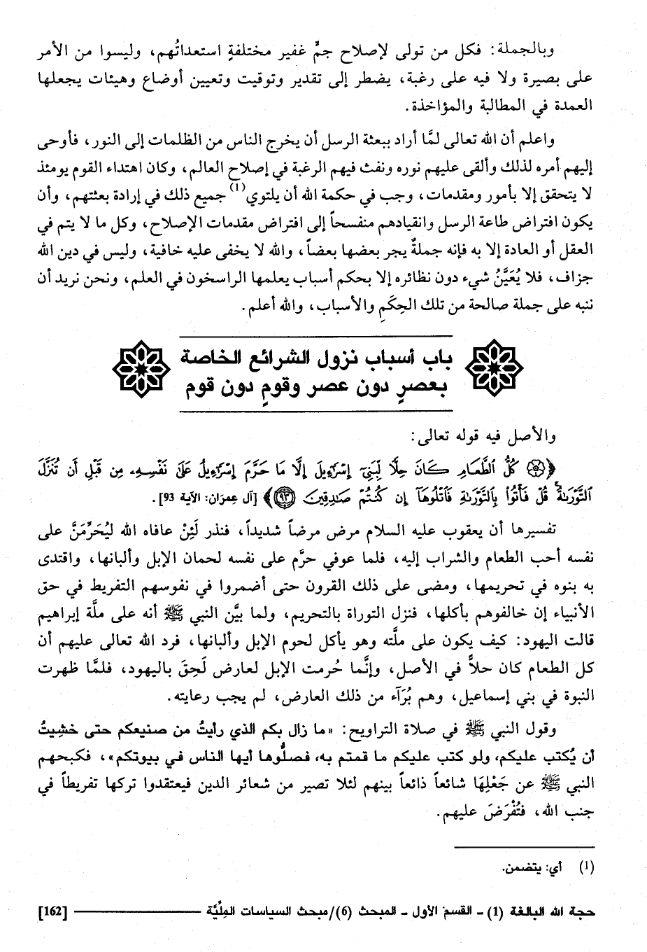 فِي إصْلَاح الْعَالم، وَكَانَ اهتداء الْقَوْم يَوْمئِذٍ لَا يتَحَقَّق إِلَّا بِأُمُور ومقدمات وَجب فِي حِكْمَة الله أَن يلتوى جَمِيع ذَلِك فِي إِرَادَة بعثتهم، وَأَن يكون افتراض طَاعَة الرُّسُل وانقيادهم منفسحا إِلَى افتراض مُقَدمَات الْإِصْلَاح، وكل مَا لَا يتم فِي الْعقل أَو الْعَادة إِلَّا بِهِ فَإِنَّهُ جملَة بجر بَعْضهَا بَعْضًا، وَالله لَا يخفى عَلَيْهِ خافية، وَلَيْسَ فِي دين الله جزاف، فَلَا يعين شَيْء دون نَظَائِره إِلَّا بِحكم وَأَسْبَاب يعلمهَا الراسخون فِي الْعلم، وَنحن نُرِيد ان ننبه على جملَة صَالِحَة من تِلْكَ الحكم والأسباب، وَالله أعلم.