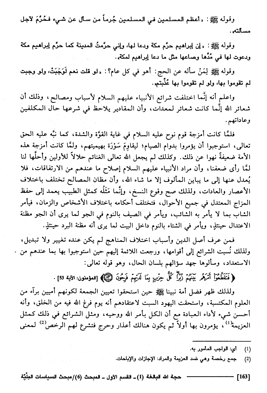 وَقَوله صَلَّى اللهُ عَلَيْهِ وَسَلَّمَ لمن سَأَلَهُ عَن الْحَج " أهوَ فِي كل عَام لَو قلت نعم لَوَجَبَتْ، وَلَو وَجَبت لم تقوموا بهَا، وَلَو لم تقوموا بهَا عذبتم ". وَاعْلَم أَنه إِنَّمَا اخْتلفت شرائع الْأَنْبِيَاء عَلَيْهِم السَّلَام لأسباب ومصالح، وَذَلِكَ أَن شَعَائِر الله إِنَّمَا كَانَت شَعَائِر لمعدات وَأَن الْمَقَادِير يُلَاحظ فِي شرعها حَال الْمُكَلّفين وعاداتهم.