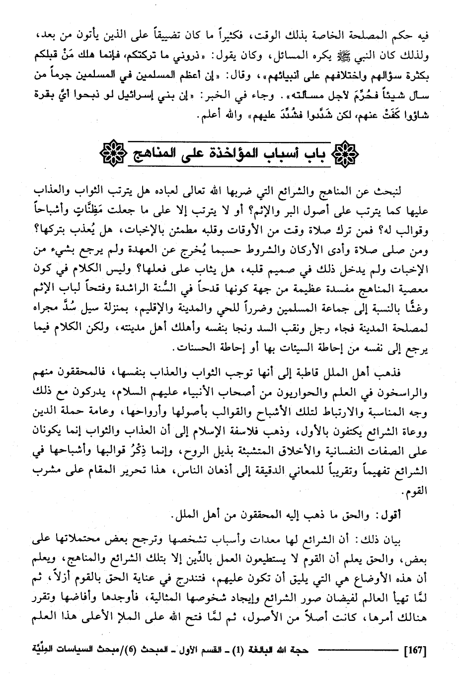 لنبحث عَن المناهج والشرائع الَّتِي ضربهَا الله تَعَالَى لِعِبَادِهِ هَل يَتَرَتَّب الثَّوَاب وَالْعَذَاب عَلَيْهَا كَمَا يَتَرَتَّب على أصُول الْبر والاثم، أَو لَا يَتَرَتَّب إِلَّا على مَا جعلت مظنات وأشباحا وقوالب لَهُ؟ فَمن ترك صَلَاة وَقت من الْأَوْقَات، وَقَلبه مطمئن بالاخبات، هَل يعذب بِتَرْكِهَا؟ وَمن صلى صَلَاة وَأدّى الْأَركان والشروط حَسْبَمَا يخرج عَن الْعهْدَة، وَلم يرجع بِشَيْء من الاخبات، وَلم يدْخل ذَلِك فِي صميم قلبه هَل يُثَاب على فعلهَا؟ وَلَيْسَ الْكَلَام فِي كَون مَعْصِيّة المناهج مفْسدَة عَظِيمَة من جِهَة كَونهَا قدحا فِي السّنة الراشدة، وفتحا لباب الْإِثْم، وغشا بِالنِّسْبَةِ إِلَى جمَاعَة الْمُسلمين، وضررا للحي وَالْمَدينَة والإقليم بِمَنْزِلَة سيل سد مجْرَاه لمصْلحَة الْمَدِينَة، فجَاء رجل،