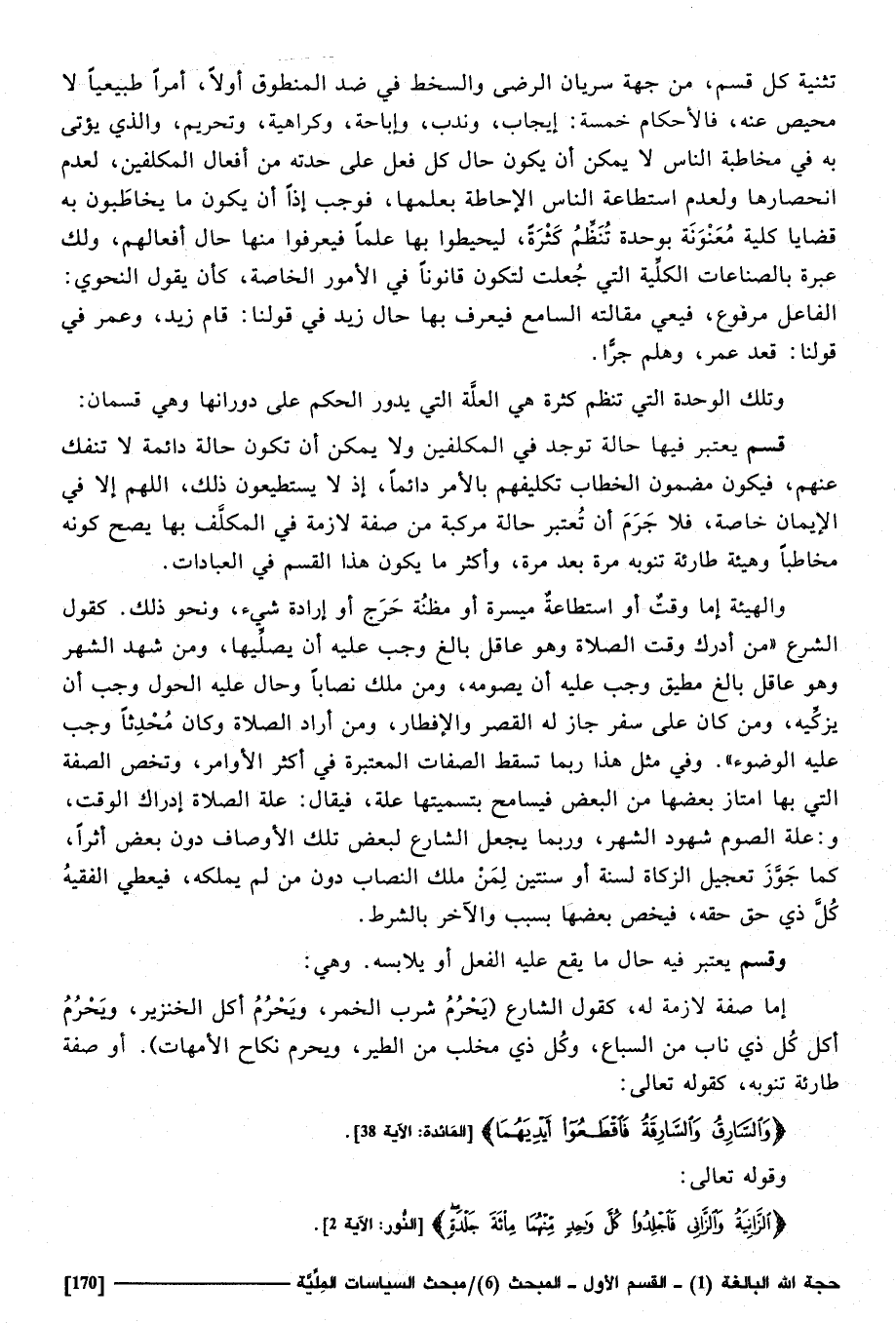 تَثْنِيَة كل قسم من جِهَة سريان الرِّضَا والسخط فِي ضد الْمَنْطُوق أَولا أمرا طبيعيا لَا محيص عَنهُ، فالأحكام خَمْسَة: إِيجَاب، وَندب، وَإِبَاحَة، وكراهية، وَتَحْرِيم، وَالَّذِي يُؤْتى بِهِ فِي مُخَاطبَة النَّاس لَا يُمكن أَن يكون حَال كل فعل على حِدته من أَفعَال الْمُكَلّفين لعدم انحصارها، وَلعدم استطاعة النَّاس الْإِحَاطَة بعلمها، فَوَجَبَ إِذا أَن يكون مَا يخاطبون بِهِ قضايا كُلية معنوية بوحدة تنظم كَثْرَة، ليحيطوا بهَا علما، فيعرفوا مِنْهَا حَال أفعالهم، وَلَك عِبْرَة بالصناعات الْكُلية الَّتِي جعلت لتَكون قانونا فِي الْأُمُور الْخَاصَّة يَقُول النَّحْوِيّ: الْفَاعِل مَرْفُوع فيعي مقَالَته السَّامع، فَيعرف بهَا حَال زيد فِي قَوْلنَا قَامَ زيد، وَعمر فِي قَوْلنَا قعد عمر، وهلم جرا، وَتلك الْوحدَة الَّتِي تنظم كَثْرَة هِيَ الْعلَّة الَّتِي يَدُور الحكم على دوراناها وَهِي قِسْمَانِ: