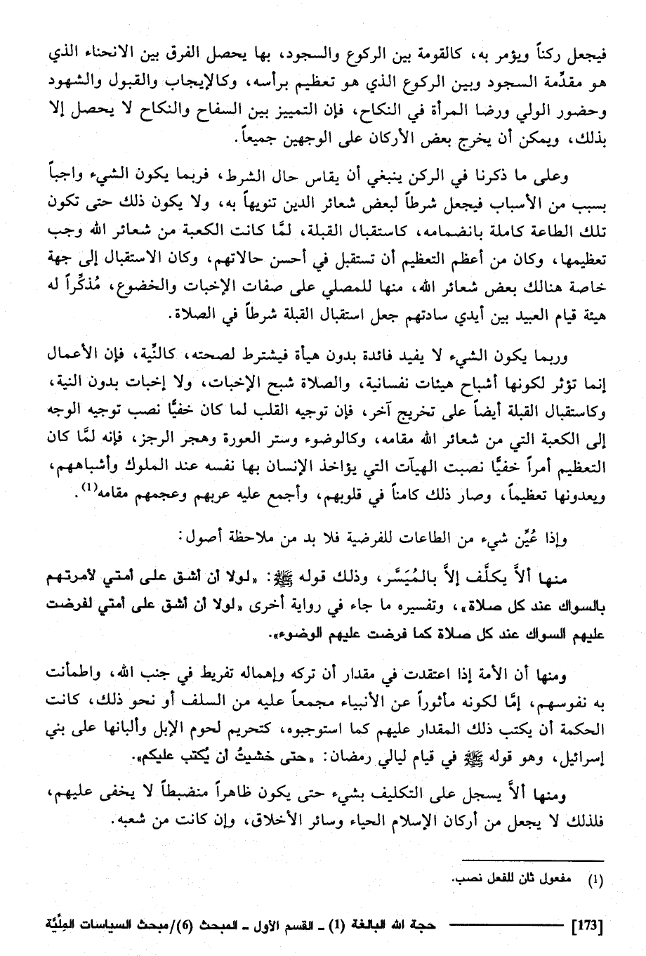 وَإِذا عين شَيْء من الطَّاعَات للفرضية فَلَا بُد من مُلَاحظَة أصُول: مِنْهَا أَلا يُكَلف إِلَّا بالميسر، وَذَلِكَ قَوْله صَلَّى اللهُ عَلَيْهِ وَسَلَّمَ " لَوْلَا أَن أشق على أمتِي لأمرتهم بِالسِّوَاكِ عِنْد كل صَلَاة " وَتَفْسِيره مَا جَاءَ فِي رِوَايَة أُخْرَى " لَوْلَا أَن أشق على أمتِي لفرضت عَلَيْهِم السِّوَاك عِنْد كل صَلَاة كَمَا فرضت عَلَيْهِم الْوضُوء ". وَمِنْهَا أَن الْأمة إِذا اعتقدت فِي مِقْدَار أَن تَركه وإهماله تَفْرِيط فِي جنب الله، واطمأنت بِهِ نُفُوسهم إِمَّا لكَونه مأثورا عَن الْأَنْبِيَاء مجمعا عَلَيْهِ من السّلف أَو نَحْو ذَلِك - كَانَت الْحِكْمَة أَن يكْتب ذَلِك الْمِقْدَار عَلَيْهِم كَمَا استوجبوه، كتحريم لُحُوم الْإِبِل وَأَلْبَانهَا على بني إِسْرَائِيل وَهُوَ قَوْله صَلَّى اللهُ عَلَيْهِ وَسَلَّمَ فِي قيام ليَالِي رَمَضَان حَتَّى: " خشيت أَن يكْتب عَلَيْكُم ".