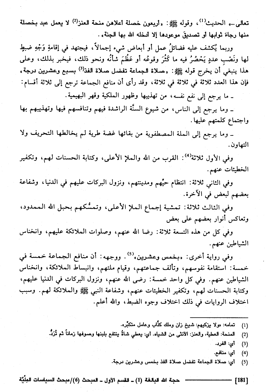 تَعَالَى " الحَدِيث وَقَوله صَلَّى اللهُ عَلَيْهِ وَسَلَّمَ " أَرْبَعُونَ خصْلَة أعلاهن منحة العنز لَا يعْمل عبد بخصلة مِنْهَا رَجَاء ثَوَابهَا أَو تَصْدِيق موعودها إِلَّا أدخلهُ الله بهَا الْجنَّة " وَرُبمَا يكْشف عَلَيْهِ فَضَائِل عمل أَو أبعاض شَيْء إِجْمَالا، فيجتهد فِي إِقَامَة وَجه ضبط لَهَا وَنصب عدد يحصر فِيهِ مَا كثر وُقُوعه أَو عظم شَأْنه وَنَحْو ذَلِك، فيخبر بذلك، وعَلى هَذَا يَنْبَغِي أَن يخرج قَوْله صَلَّى اللهُ عَلَيْهِ وَسَلَّمَ " صَلَاة الْجَمَاعَة تفضل صَلَاة الغذ بِسبع وَعشْرين دَرَجَة " فَإِن هَذَا الْعدَد ثَلَاثَة فِي ثَلَاثَة فِي ثَلَاثَة، وَقد رأى أَن مَنَافِع الْجَمَاعَة ترجع إِلَى ثَلَاثَة أَقسَام: مَا يرجع إِلَى نفع نَفسه من تهذيبها وَظُهُور الملكية وقهر البهيمية، وَمَا يرجع إِلَى النَّاس من شيوع السّنة الراشدة فيهم وتنافسهم فِيهَا وتهذيبهم بهَا واجتماع كلمتهم عَلَيْهَا، وَمَا يرجع إِلَى الْملَّة المصطفوية من بَقَائِهَا غضة طرية لم يخالطها التحريف وَلَا التهاون وَفِي الأول ثَلَاثَة: الْقرب من الله وَالْمَلَأ الْأَعْلَى، وَكِتَابَة الْحَسَنَات لَهُم، وتكفير الخطيآت عَنْهُم، وَفِي الثَّانِي ثَلَاثَة: