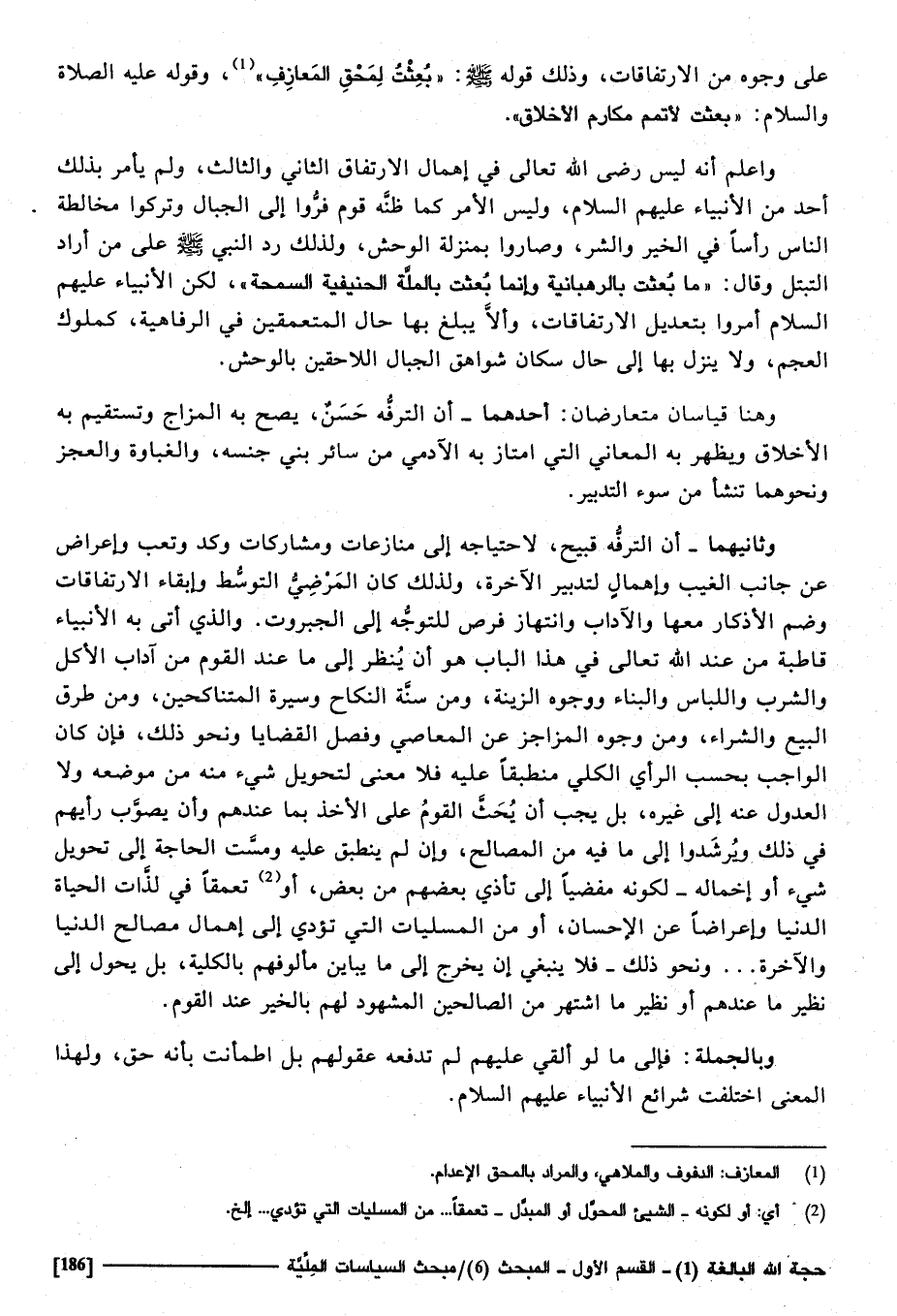 وَثَانِيهمَا أَن الترفه قَبِيح لاحتياجه إِلَى منازعات ومشاركات وكد وتعب وإعراض عَن جَانب الْغَيْب وإهمال لتدبير الْآخِرَة، وَلذَلِك كَانَ المرضى التَّوَسُّط وإبقاء الارتفاقات وَضم الْأَذْكَار مَعهَا والآداب وانتهاز فرص للتوجه إِلَى الجبروت، وَالَّذِي أَتَى بِهِ الْأَنْبِيَاء قاطبة من عِنْد الله تَعَالَى فِي هَذَا الْبَاب هُوَ أَن ينظر إِلَى مَا عِنْد الْقَوْم من آدَاب الْأكل وَالشرب واللباس وَالْبناء ووجوه الزِّينَة، وَمن سنة النِّكَاح وسيرة المتناكحين، وَمن طرق البيع وَالشِّرَاء، وَمن وُجُوه المزاجر عَن الْمعاصِي وَفصل القضايا وَنَحْو ذَلِك. فَإِن كَانَ الْوَاجِب بِحَسب الرَّأْي الْكُلِّي منطبقا عَلَيْهِ، فَلَا معنى لتحويل شَيْء مِنْهُ من مَوْضِعه وَلَا الْعُدُول عَنهُ إِلَى غَيره، بل يجب أَن يحث الْقَوْم على الْأَخْذ بِمَا عِنْدهم، وَأَن يصوب رَأْيهمْ فِي ذَلِك، ويرشدوا إِلَى مَا فِيهِ من الْمصَالح، وَإِن لم ينْطق عَلَيْهِ، ومست الْحَاجة إِلَى تَحْويل شَيْء أَو إخماله لكَونه مفضيا إِلَى تأذي بَعضهم من بعض أَو تعمقا فِي لذات الْحَيَاة الدُّنْيَا وإعراضا عَن الْإِحْسَان، أَو من المسليات الَّتِي تُؤدِّي إِلَى إهمال مصَالح الدُّنْيَا وَالْآخِرَة