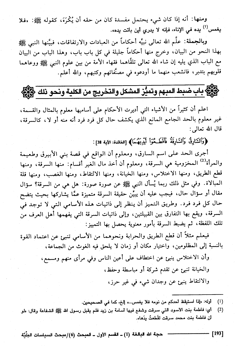 أجري الْحَد على اسْم السَّارِق، وَمَعْلُوم أَن الْوَاقِع فِي قصَّة بني الأبيرق وَطعيمَة وَالْمَرْأَة المخزومية هِيَ السّرقَة وَمَعْلُوم أَن اخذ مَال الْغَيْر أَقسَام: مِنْهَا السّرقَة، وَمِنْهَا قطع الطَّرِيق، وَمِنْهَا الاختلاس، وَمِنْهَا الْخِيَانَة، وَمِنْهَا الِالْتِقَاط، وَمِنْهَا الْغَصْب، وَمِنْهَا قلَّة المبالاة، وَفِي مثل ذَلِك رُبمَا يسْأَل النَّبِي صَلَّى اللهُ عَلَيْهِ وَسَلَّمَ عَن صُورَة صُورَة هَل هِيَ من السّرقَة سُؤال مقَال أَو سُؤال حَال، فَيجب عَلَيْهِ أَن يبين حَقِيقَة السّرقَة متميزة عَمَّا يشاركها بِحَيْثُ يَتَّضِح حَال كل فَرد فَرد، وَطَرِيق التميز أَن ينظر إِلَى ذاتيات هَذِه الْأَسَامِي الَّتِي لَا تُوجد فِي السّرقَة، وَيَقَع بهَا التفارق بَين الْقبْلَتَيْنِ وَإِلَى ذاتيات السّرقَة الَّتِي يفهمها أهل الْعرف من تِلْكَ اللَّفْظَة، ثمَّ يضْبط السّرقَة بِأُمُور معنوية يحصل بهَا التَّمْيِيز، فَيعلم مثلا أَن قطع الطَّرِيق والحرابة وَنَحْوهمَا من الْأَسَامِي تنبئ عَن اعْتِمَاد الْقُوَّة بِالنِّسْبَةِ إِلَى المظلومين وَاخْتِيَار مَكَان أَو زمَان لَا يلْحق فِيهِ