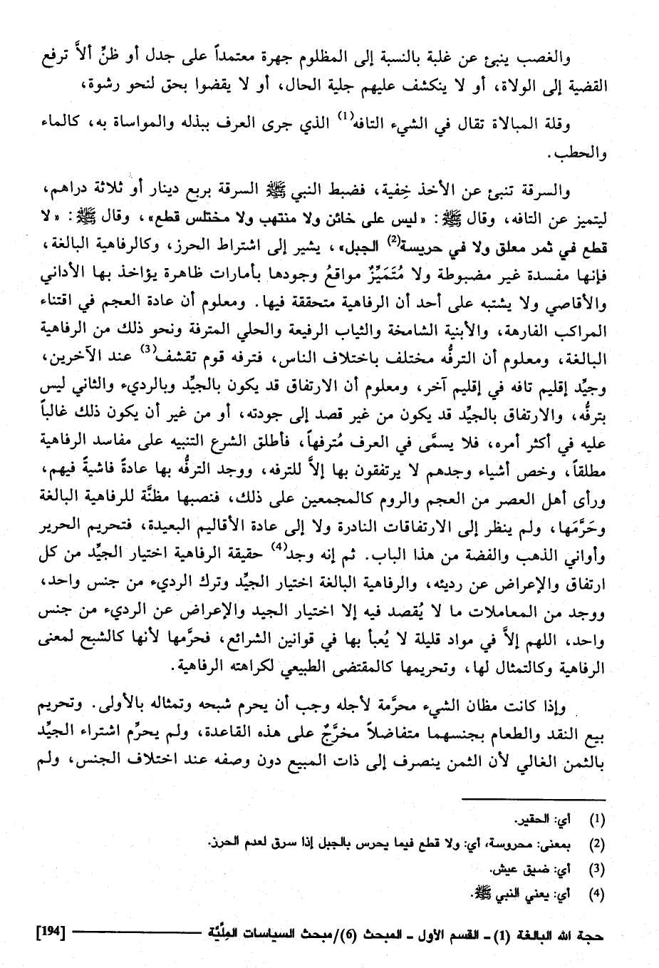 وَالْغَصْب يُنبئ عَن غَلَبَة بِالنِّسْبَةِ إِلَى الْمَظْلُوم جهرة مُعْتَمدًا على جدل أَو ظن أَلا ترفع الْقَضِيَّة إِلَى الْوُلَاة، أَو لَا ينْكَشف عَلَيْهِم جلية الْحَال، أَو لَا يقضوا بِحَق لنَحْو رشوة، وَقلة المبالاة تقال فِي الشَّيْء التافه الَّذِي جرى الْعرف ببذله والمواساة بِهِ كَالْمَاءِ والحطب، وَالسَّرِقَة تنبئ عَن الْأَخْذ خُفْيَة، فضبط النَّبِي صَلَّى اللهُ عَلَيْهِ وَسَلَّمَ السّرقَة بِربع دِينَار أَو ثَلَاثَة دَرَاهِم، ليتميز عَن التافه وَقَالَ: " لَيْسَ على خائن وَلَا منتهب وَلَا مختلس قطع " وَقَالَ " لَا قطع فِي ثَمَر مُعَلّق وَلَا فِي حريسة الْجَبَل " يُشِير إِلَى اشْتِرَاط الْحِرْز و، كالرفاهية الْبَالِغَة فَإِنَّهَا مفْسدَة غير مضبوطة، وَلَا متميز مواقع وجودهَا بأمارات ظَاهِرَة يُؤَاخذ بهَا الأداني والأقاصي، وَلَا يشْتَبه على أحد أَن الرَّفَاهِيَة متحققة فِيهَا، مَعْلُوم أَن عَادَة الْعَجم فِي اقتناء المراكب الفارهة والأبنية الشامخة وَالثيَاب الرفيعة والحلي المترفة وَنَحْو ذَلِك من الرَّفَاهِيَة الْبَالِغَة، وَمَعْلُوم أَن الترفه مُخْتَلف باخْتلَاف النَّاس، فترفه قوم تقشف عِنْد الآخرين، وجيد إقليم تافه فِي إقليم آخر، وَمَعْلُوم أَن الارتفاق قد يكون بالجيد وبالرديء وَالثَّانِي لَيْسَ بترفه ... ، والارتفاق بالجيد قد يكون من غير قصد إِلَى جودته، أَو من غير أَن يكون ذَلِك غَالِبا عَلَيْهِ فِي أَكثر أمره، فَلَا يُسمى فِي الْعرف مترفها، فَأطلق الشَّرْع التنبه على مفاسد الرَّفَاهِيَة مُطلقًا، وَخص أَشْيَاء وجدهم لَا يرتفقون بهَا إِلَّا للترفه، وَوجد الترفه بهَا عَادَة فَاشِية فيهم، وَرَأى أهل الْعَصْر من الْعَجم وَالروم كالمجمعين على ذَلِك، فنصبها مَظَنَّة للرفاهية الْبَالِغَة، وحرمها، وَلم ينظر إِلَى الارتفاقات النادرة، وَلَا إِلَى عَادَة الأقاليم الْبَعِيدَة، فتحريم الْحَرِير وأواني الذَّهَب وَالْفِضَّة من هَذَا الْبَاب، ثمَّ أَنه وجد حَقِيقَة الرَّفَاهِيَة اخْتِيَار الْجيد