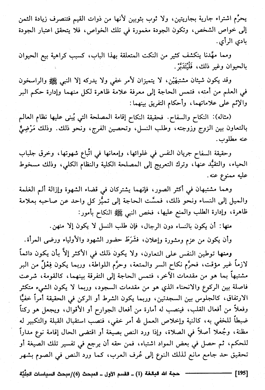 وَمِمَّا مهدنا ينْكَشف كثير من النكت الْمُتَعَلّقَة بِهَذَا الْبَاب كسبب كَرَاهِيَة بيع الْحَيَوَان بِالْحَيَوَانِ وَغير ذَلِك، فليتدبر، وَقد يكون شيآن مشتبهين لَا يتميزان لأمر خَفِي لَا يُدْرِكهُ إِلَّا النَّبِي صَلَّى اللهُ عَلَيْهِ وَسَلَّمَ والراسخون فِي الْعلم من أمته، فتمس الْحَاجة إِلَى معرفَة عَلامَة ظَاهِرَة لكل مِنْهُمَا وإدارة حكم الْبر وَالْإِثْم على علاماتهما، وَأَحْكَام التَّفْرِيق بَينهمَا (مِثَاله) النِّكَاح والسفاح فحقيقة النِّكَاح إِقَامَة الْمصلحَة الَّتِي يبْنى عَلَيْهَا نظام الْعَالم بالتعاون بَين الزَّوْج وَزَوجته وَطلب النَّسْل وتحصين الْفرج وَنَحْو ذَلِك، وَذَلِكَ مرضى عَنهُ مَطْلُوب، وَحَقِيقَة السفاح جَرَيَان النَّفس فِي غلوائها وإمعانها فِي اتِّبَاع شهوتها وخرق جِلْبَاب الْحيَاء والتقيد عَنْهَا وَترك التعريج إِلَى الْمصلحَة الْكُلية والنظام الْكُلِّي، وَذَلِكَ مسخوط عَلَيْهِ مَمْنُوع عَنهُ، وهما متشابهان فِي أَكثر الصُّور، فَإِنَّهُمَا يَشْتَرِكَانِ فِي قَضَاء الشَّهْوَة وَإِزَالَة ألم الغلمة والميل إِلَى النِّسَاء وَنَحْو ذَلِك، فمست الْحَاجة إِلَى تميز كل وَاحِد عَن صَاحبه بعلامة ظَاهِرَة، وإدارة الطّلب وَالْمَنْع عَلَيْهَا، فحض النَّبِي صَلَّى اللهُ عَلَيْهِ وَسَلَّمَ النِّكَاح بِأُمُور (مِنْهَا) أَن يكون بِالنسَاء دون الرِّجَال، فَإِن طلب النَّسْل لَا يكون