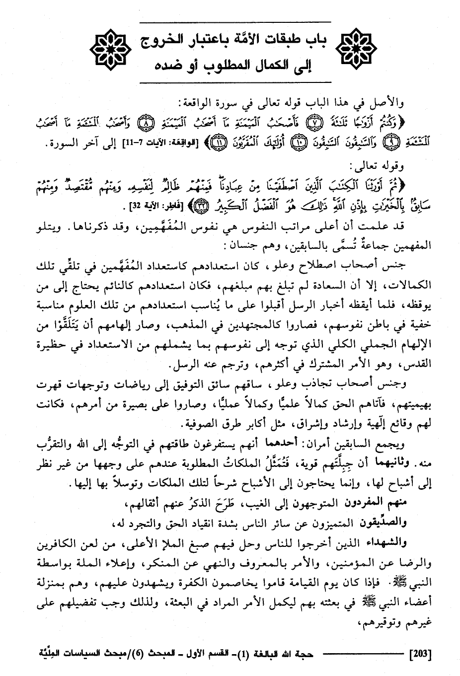 (بَاب طَبَقَات الْأمة بِاعْتِبَار الْخُرُوج إِلَى الْكَمَال الْمَطْلُوب أَو ضِدّه)
