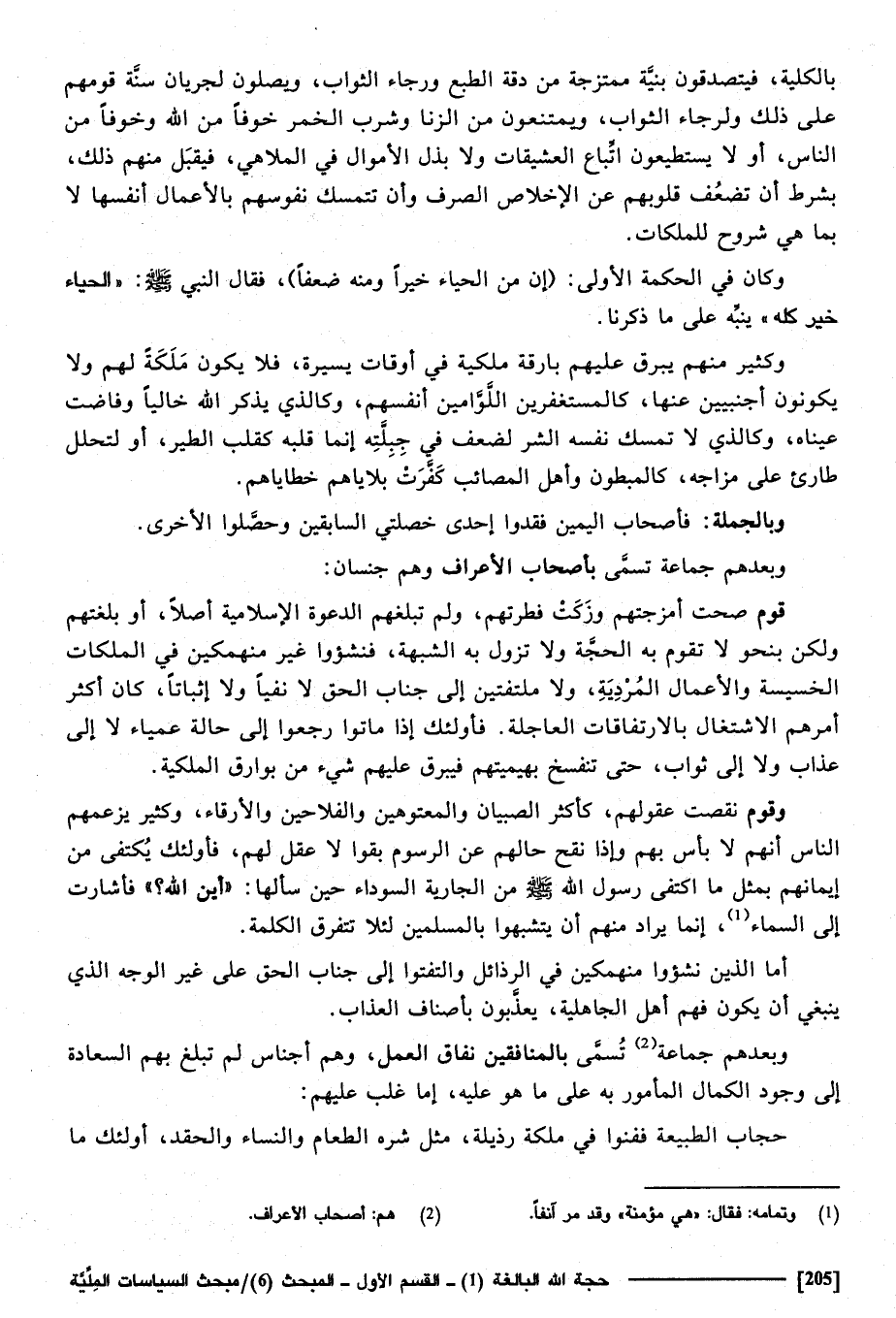 أما الَّذين نشأوا منهمكين فِي الرذائل والتفتوا إِلَى جناب الْحق على غير الْوَجْه الَّذِي يَنْبَغِي أَن يكون، فهم أهل الْجَاهِلِيَّة يُعَذبُونَ بأصناف الْعَذَاب ... ، وبعدهم جمَاعَة تسمى بالمنافقين نفاق الْعَمَل، وهم أَجنَاس لم تبلغ بهم السَّعَادَة إِلَى وجود الْكَمَال الْمَأْمُور بِهِ على مَا هُوَ عَلَيْهِ، إِمَّا غلب عَلَيْهِم حجاب الطبيعة، ففنوا فِي ملكة رذيلة مثل شَره الطَّعَام وَالنِّسَاء والحقد مَا وضعت عَنْهُم