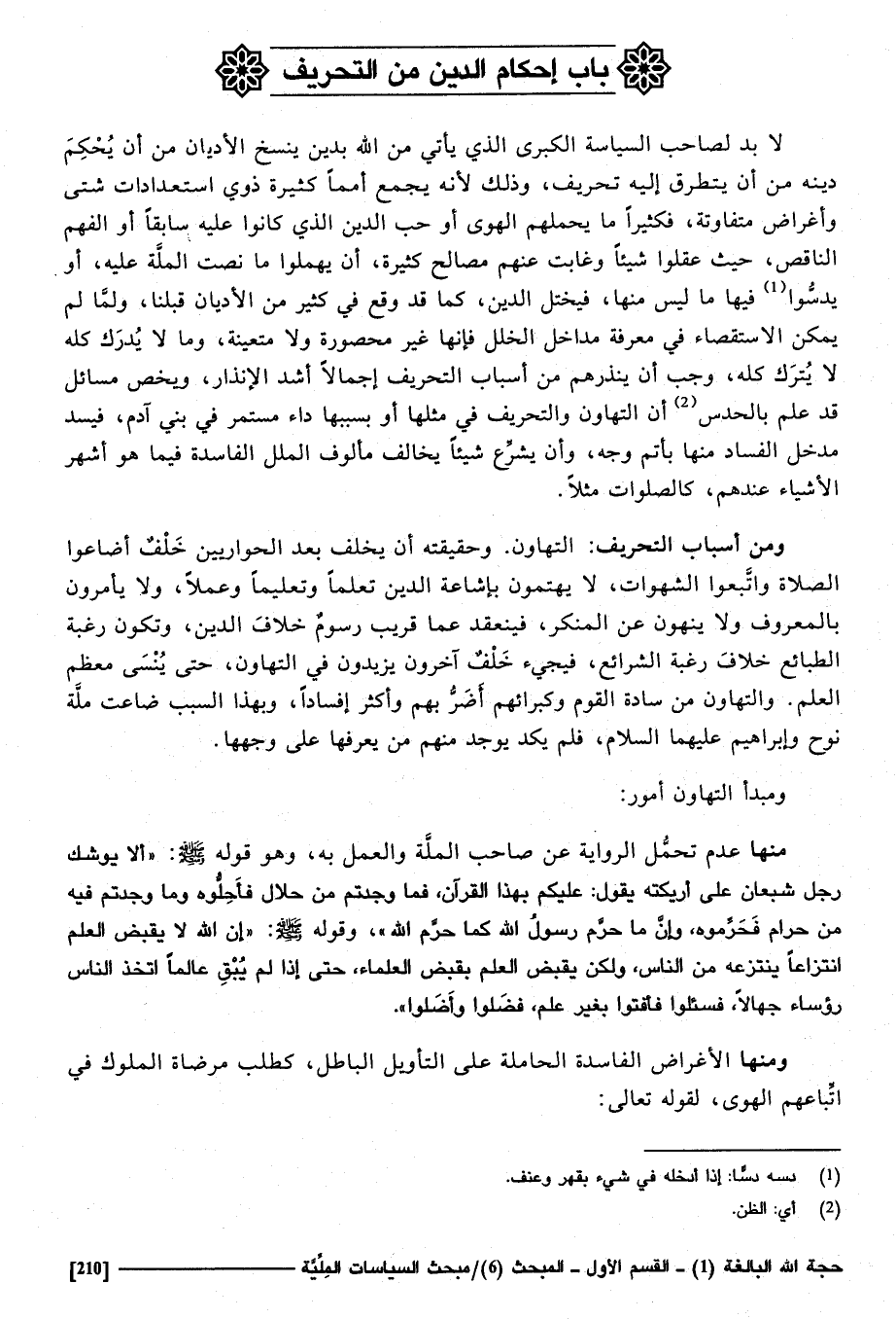 لَا بُد لصَاحب السياسة الْكُبْرَى الَّذِي يَأْتِي من الله بدين ينْسَخ الْأَدْيَان من أَن يحكم دينه من أَن يتطرف إِلَيْهِ تَحْرِيف، وَذَلِكَ لِأَنَّهُ يجمع أمما كَثِيرَة ذَوي استعدادات شَتَّى وأغراض مُتَفَاوِتَة، فكثيرا مَا يحملهم الْهوى أَو حب الدّين الَّذِي كَانُوا عَلَيْهِ سَابِقًا والفهم النَّاقِص حَيْثُ عقلوا شَيْئا، وَغَابَتْ مصَالح كَثِيرَة أَن يهملوا مَا نصت الْملَّة عَلَيْهِ، أَو يدسوا فِيهَا مَا لَيْسَ مِنْهَا، فيختل الدّين، كَمَا قد وَقع فِي كثير من الْأَدْيَان قبلنَا، وَلما لم يُمكن الِاسْتِقْصَاء