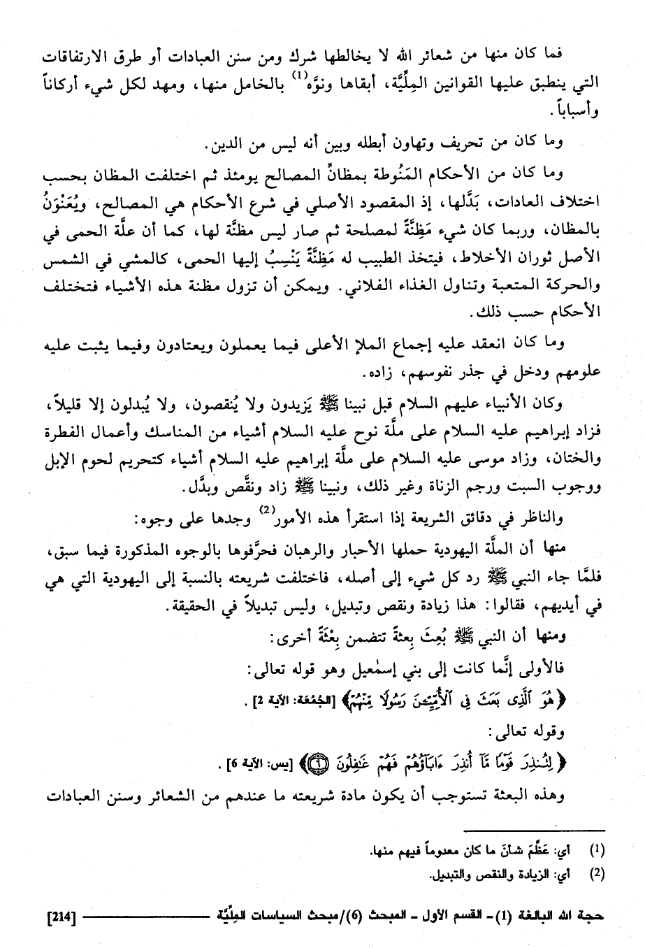فَمَا كَانَ مِنْهَا من شَعَائِر الله لَا يخالطها شرك وَمن سنَن الْعِبَادَات أَو طرق الارتفاقات الَّتِي ينطبق عَلَيْهَا القوانين الملية - أبقاها، ونوه بالخامل مِنْهَا، ومهد لكل شَيْء أركانا وأسبابا، وَمَا كَانَ من تَحْرِيف وتهاون أبْطلهُ، وَبَين أَنه لَيْسَ من الدّين ... ، وَمَا كَانَ من الْأَحْكَام المنوطة بمظان الْمصَالح يَوْمئِذٍ، ثمَّ اخْتلفت المظان بِحَسب اخْتِلَاف الْعَادَات - بدلهَا، إِذا الْمَقْصُود الْأَصْلِيّ فِي شرع الْأَحْكَام هِيَ الْمصَالح. ويعنون بالمظان، وَرُبمَا كَانَ شَيْء مَظَنَّة لمصْلحَة ثمَّ صَار لَيْسَ مَظَنَّة لَهَا، كَمَا أَن عِلّة الْحمى فِي الأَصْل ثوران الأخلاط، فيتخذ الطَّبِيب لَهُ مَظَنَّة ينْسب إِلَيْهَا الْحمى كالمشي فِي الشَّمْس وَالْحَرَكَة المتعبة وَتَنَاول الْغذَاء الْفُلَانِيّ، وَيُمكن أَن تَزُول مَظَنَّة هَذِه الْأَشْيَاء، فتختلف الْأَحْكَام حسب ذَلِك، وَمَا كَانَ انْعَقَد عَلَيْهِ إِجْمَاع الْمَلأ الْأَعْلَى فِيمَا يعْملُونَ ويعتادون، وَفِيمَا يثبت عَلَيْهِ علومهم، وَدخل فِي جذر نُفُوسهم زَاده.