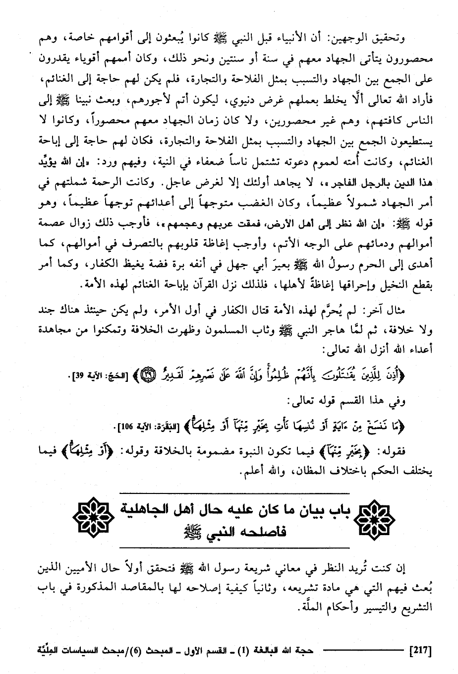 مِثَال آخر لم يحرم لهَذِهِ الْأمة قتال الْكفَّار فِي أول الْأَمر، وَلم يكن حِينَئِذٍ هُنَاكَ جند وَلَا خلَافَة، ثمَّ لما هَاجر النَّبِي صَلَّى اللهُ عَلَيْهِ وَسَلَّمَ، وثاب الْمُسلمُونَ، وَظَهَرت الْخلَافَة، وتمكنوا من مجاهدة أَعدَاء الله أنزل الله تَعَالَى: