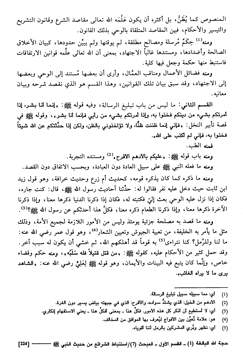 رَأْيِي، فَإِنَّمَا أَنا بشر " وَقَوله صَلَّى اللهُ عَلَيْهِ وَسَلَّمَ فِي قصَّة تأبير النّخل: " فانى إِنَّمَا ظَنَنْت ظنا، وَلَا تؤاخذوني بِالظَّنِّ، وَلَكِن إِذا حدثتكم عَن الله شَيْئا، فَخُذُوا بِهِ، فَإِنِّي لم أكذب على الله " فَمِنْهُ الطِّبّ، وَمِنْه بَاب قَوْله صَلَّى اللهُ عَلَيْهِ وَسَلَّمَ " عَلَيْكُم بالأدهم الأقرح " ومستنده التجربة، وَمِنْه مَا فعله النَّبِي صَلَّى اللهُ عَلَيْهِ وَسَلَّمَ على سَبِيل الْعَادة دون الْعِبَادَة وبحسب الِاتِّفَاق دون الْقَصْد، وَمِنْه مَا ذكره كَمَا كَانَ يذكرهُ قومه كَحَدِيث أم زرع وَحَدِيث خرافة وَهُوَ قَول زيد بن ثَابت حَيْثُ دخل عَلَيْهِ نفر، فَقَالُوا لَهُ حَدثنَا أَحَادِيث رَسُول الله صَلَّى اللهُ عَلَيْهِ وَسَلَّمَ قَالَ: " كنت جَاره، فَكَانَ إِذا نزل عَلَيْهِ الْوَحْي بعث إِلَيّ، فكتبته لَهُ، فَكَانَ إِذا ذكرنَا الدُّنْيَا ذكرهَا مَعنا، وَإِذا ذكرنَا الْآخِرَة ذكرهَا مَعنا، وَإِذا ذكرنَا الطَّعَام ذكره مَعنا، فَكل هَذَا أحدثكُم عَن رَسُول الله صَلَّى اللهُ عَلَيْهِ وَسَلَّمَ، وَمِنْه مَا قصد بِهِ مصلحَة جزئية يَوْمئِذٍ وَلَيْسَ من الْأَمر اللَّازِمَة لجَمِيع الْأمة، وَذَلِكَ مثل مَا يَأْمر بِهِ الْخَلِيفَة من تعبئة الجيوش وَتَعْيِين الشعار، وَهُوَ قَول عمر رَضِي الله عَنهُ: مَا لنا وللرمل كُنَّا نتراءى بِهِ قوما قد أهلكهم الله، ثمَّ خشِي أَن يكون لَهُ سَبَب آخر، وَقد حمل كثير من الْأَحْكَام عَلَيْهِ كَقَوْلِه صَلَّى اللهُ عَلَيْهِ وَسَلَّمَ: " من قتل قَتِيلا فَلهُ سلبة " وَمِنْه حكم وَقَضَاء خَاص، وَإِنَّمَا كَانَ يتبع فِيهِ الْبَينَات والايمان وَهُوَ قَوْله صَلَّى اللهُ عَلَيْهِ وَسَلَّمَ لعَلي رَضِي الله عَنهُ: " الشَّاهِد يرى مَا لَا يرَاهُ الْغَائِب ".