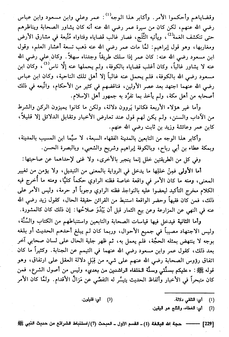 مَكَّة، وَلم يَأْخُذ بِمَا تفرد بِهِ جُمْهُور أهل الْإِسْلَام، وَأما غير هَؤُلَاءِ الْأَرْبَعَة فَكَانُوا يروون دلَالَة، وَلَكِن مَا كَانُوا يميزون الرُّكْن وَالشّرط من الْآدَاب وَالسّنَن، وَلم يكن لَهُم قَول عِنْد تعَارض الْأَخْبَار وتقابل الدَّلَائِل إِلَّا قَلِيلا كَابْن عمر وَعَائِشَة وَزيد بن ثَابت رَضِي الله عَنْهُم، وأكابر هَذَا الْوَجْه من التَّابِعين بِالْمَدِينَةِ الْفُقَهَاء السَّبْعَة لَا سِيمَا ابْن الْمسيب بِالْمَدِينَةِ، وبمكة عَطاء ابْن أبي رَبَاح، وبالكوفة إِبْرَاهِيم وَشُرَيْح وَالشعْبِيّ، وبالبصرة الْحسن. وَفِي 1 كل من الطريقتين خلل إِنَّمَا ينجبر بِالْأُخْرَى، وَلَا غنى لأحداهما عَن صاحبتها.